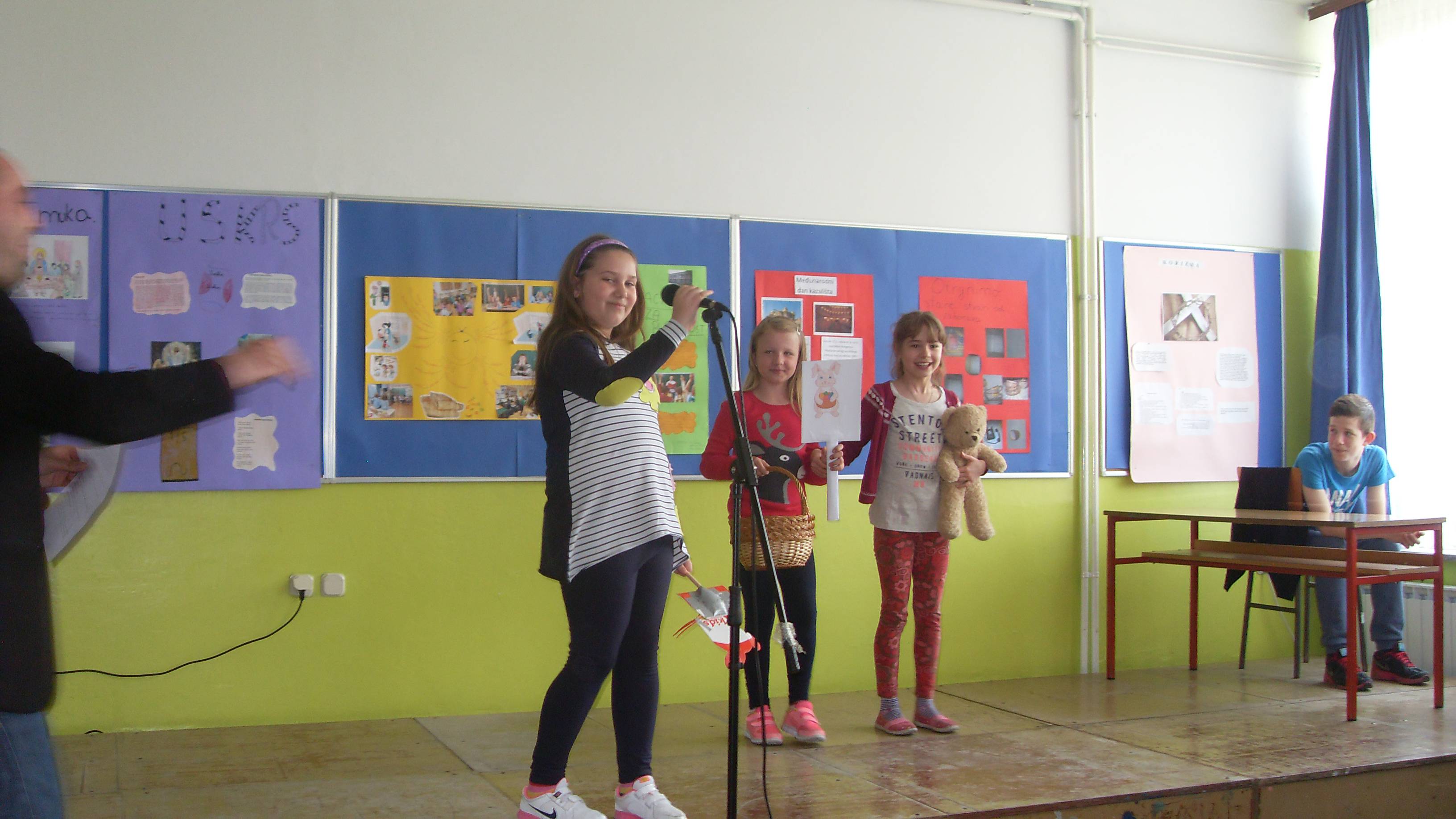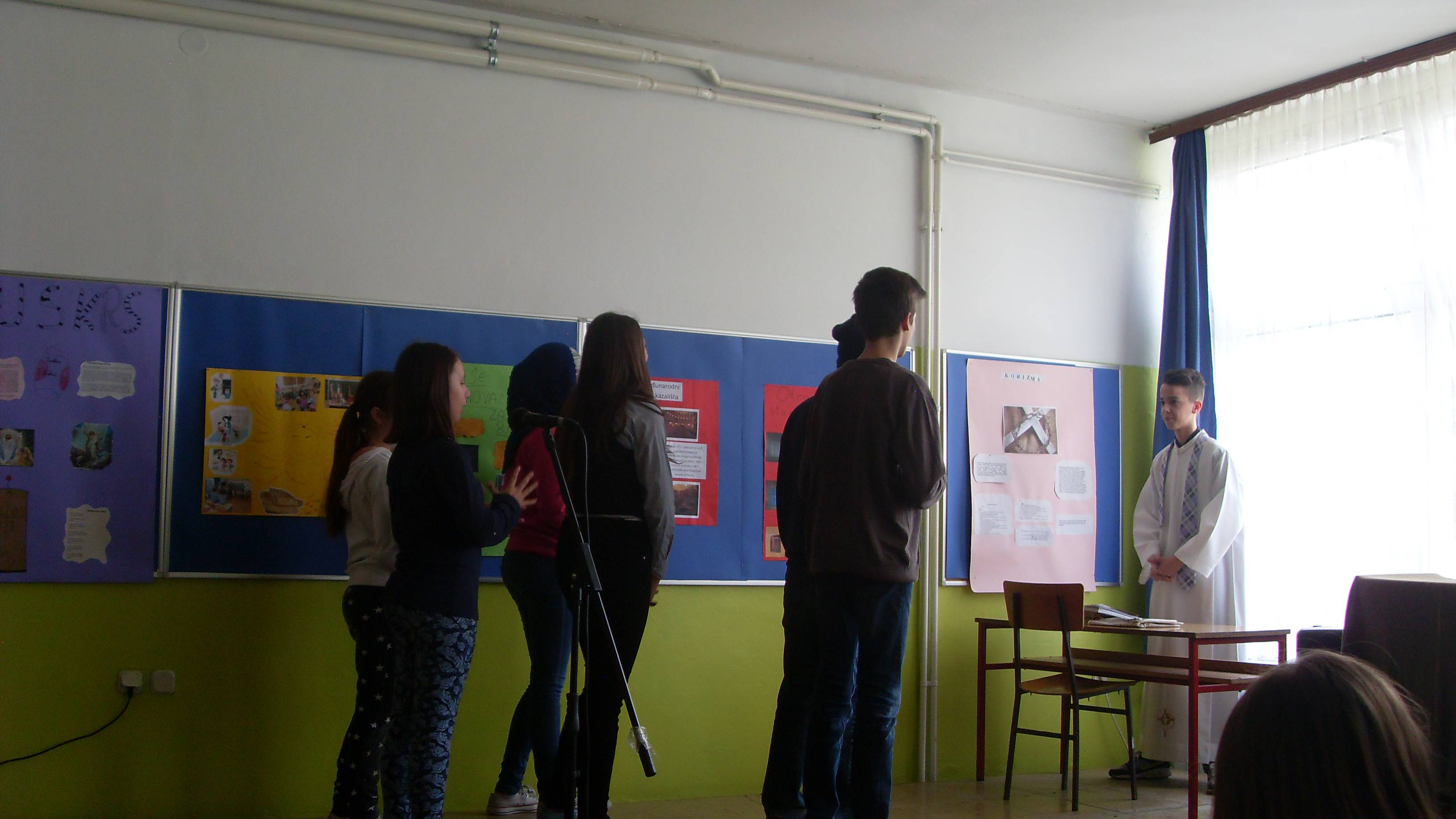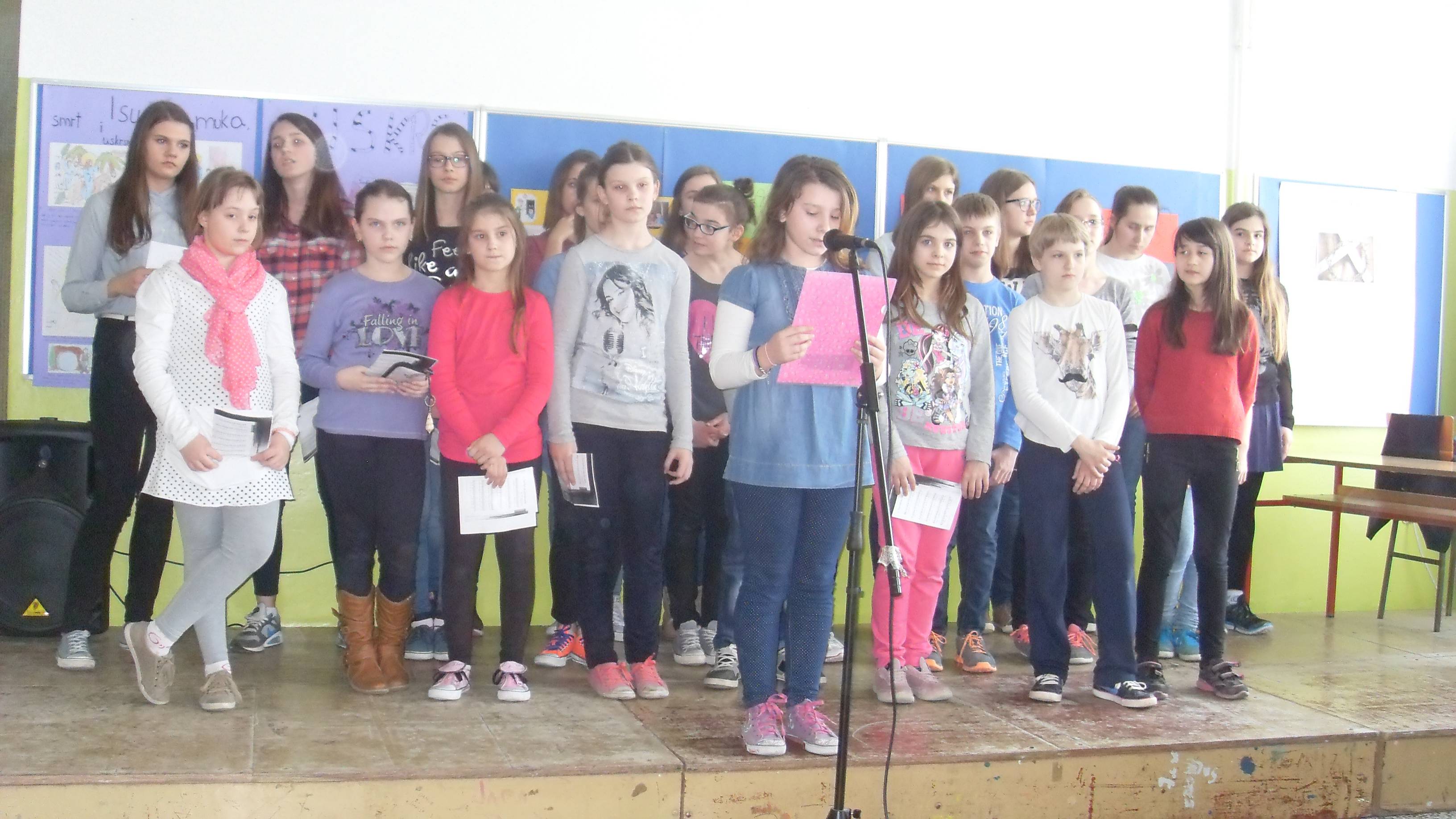 Učenice 4.a razreda Lana, Dora i Nika recitirale su pjesme: Uskrsni zeko, Pisanica i Veselimo se Uskrsu. Vjeronaučno - dramska skupina prikazala je igrokaz - Uskrs u mojoj obitelji a učenici 2.b igrokaz Uskrsni medo!. Sve je to začinio zbor pjesmama: Da te samo dotaknem, Tvoj crveni plašt i Ostani s nama.