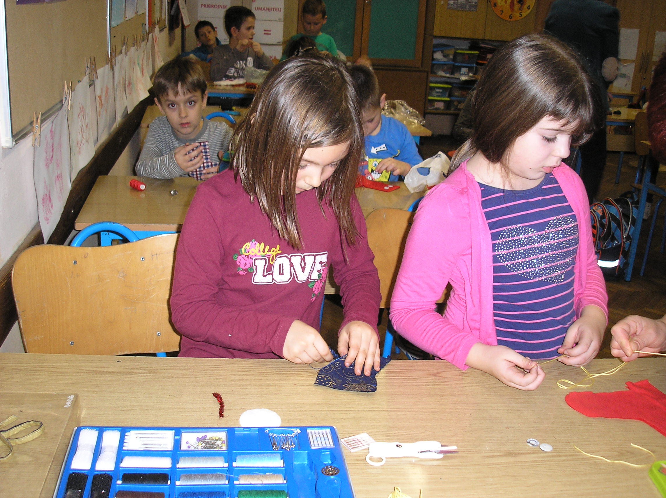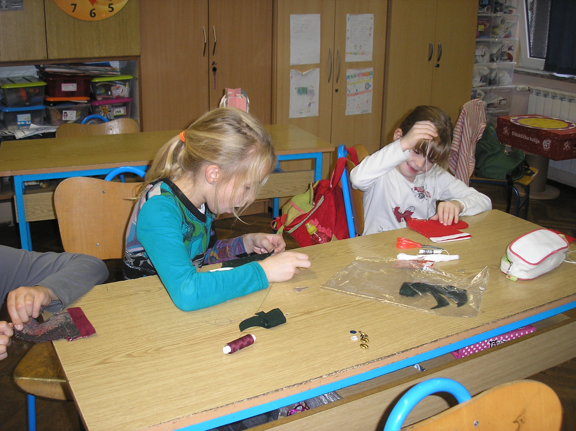 Pripremili smo tkaninu, nožice, iglu i konac. Mame su nam izrezale čizme, a mi smo svojim vrijednim ručicama šivali. Odmah na početku susreli smo se s velikim problemom. Trebalo je uvući konac u iglu. Sva sreća imali smo pomoć učiteljice, Maxove i Leonardove mame pa je to i uspjelo. Onda je došlo na red i šivanje. Kako smo šivali dok nam se iz igle izvlačio konac, mrsio se i zapinjao to si možete samo zamisliti i slatko se nasmijati.