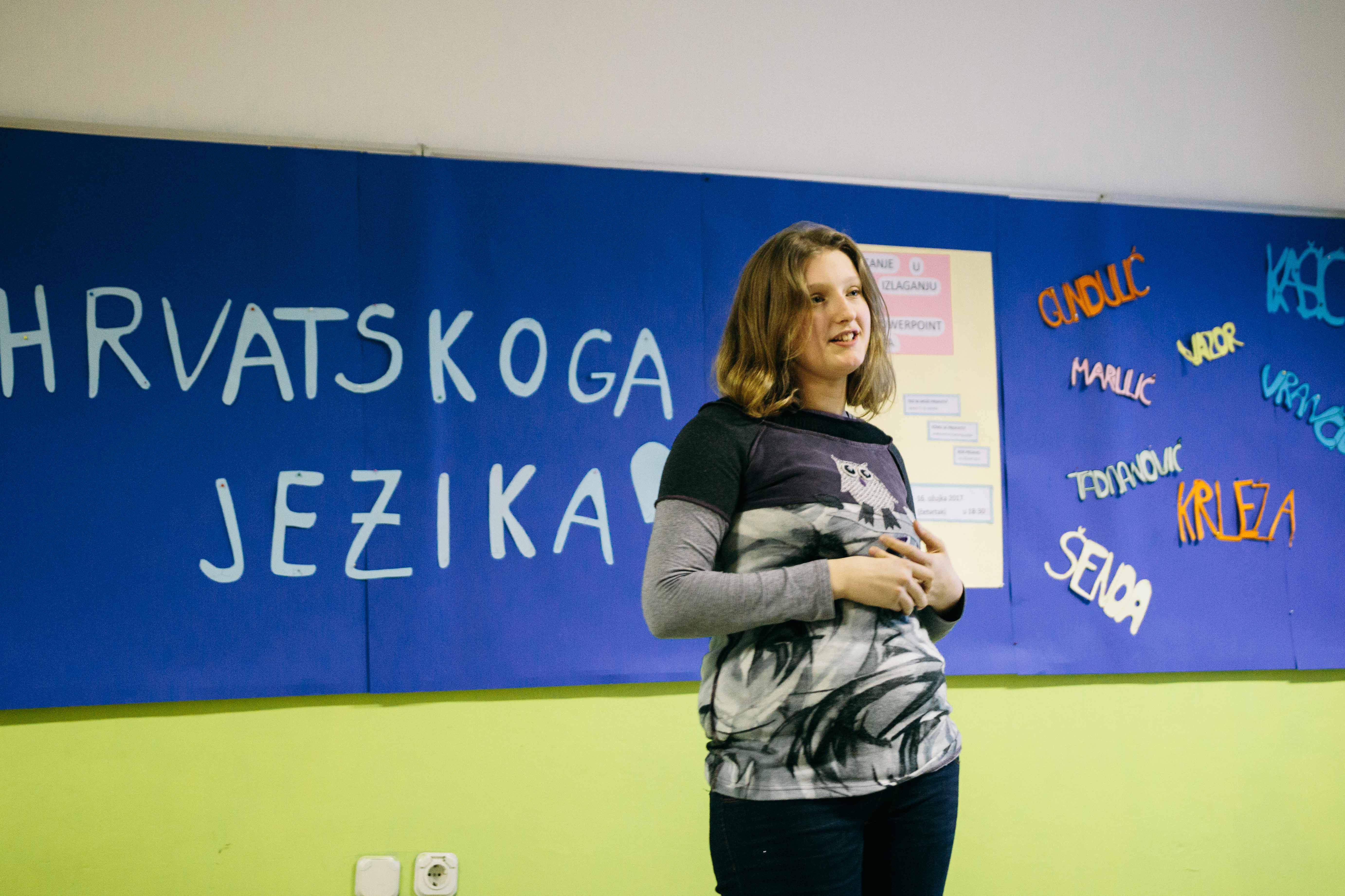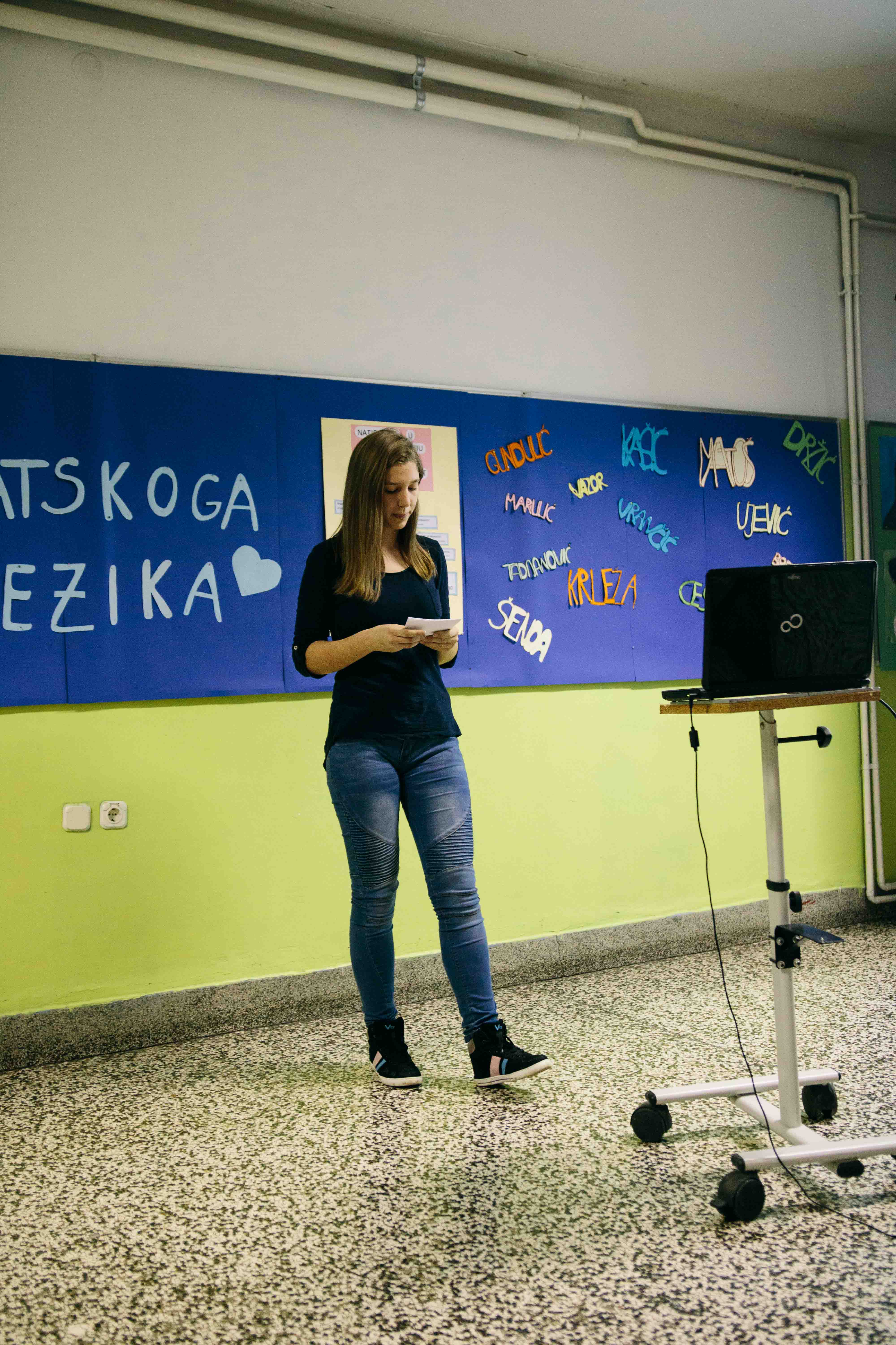 Dani hrvatskoga jezika u našoj školi završili su natjecanjem sedmaša i osmaša u izlaganju pomoću PowerPointa. Najuspješniji su bili sljedeći učenici: 3. mjesto osvojila je Mia Martinović (8.b) s prezentacijom o Cliveu Staplesu Lewisu, 2. mjesto podijelile su Nika Podić (8.b) i Klara Perković (7.a), obje su predstavljale Ivanu Brlić Mažuranić, a najbolje izlaganje održala je Una Ibrahimagić (8.a) o J.K. Rawling.