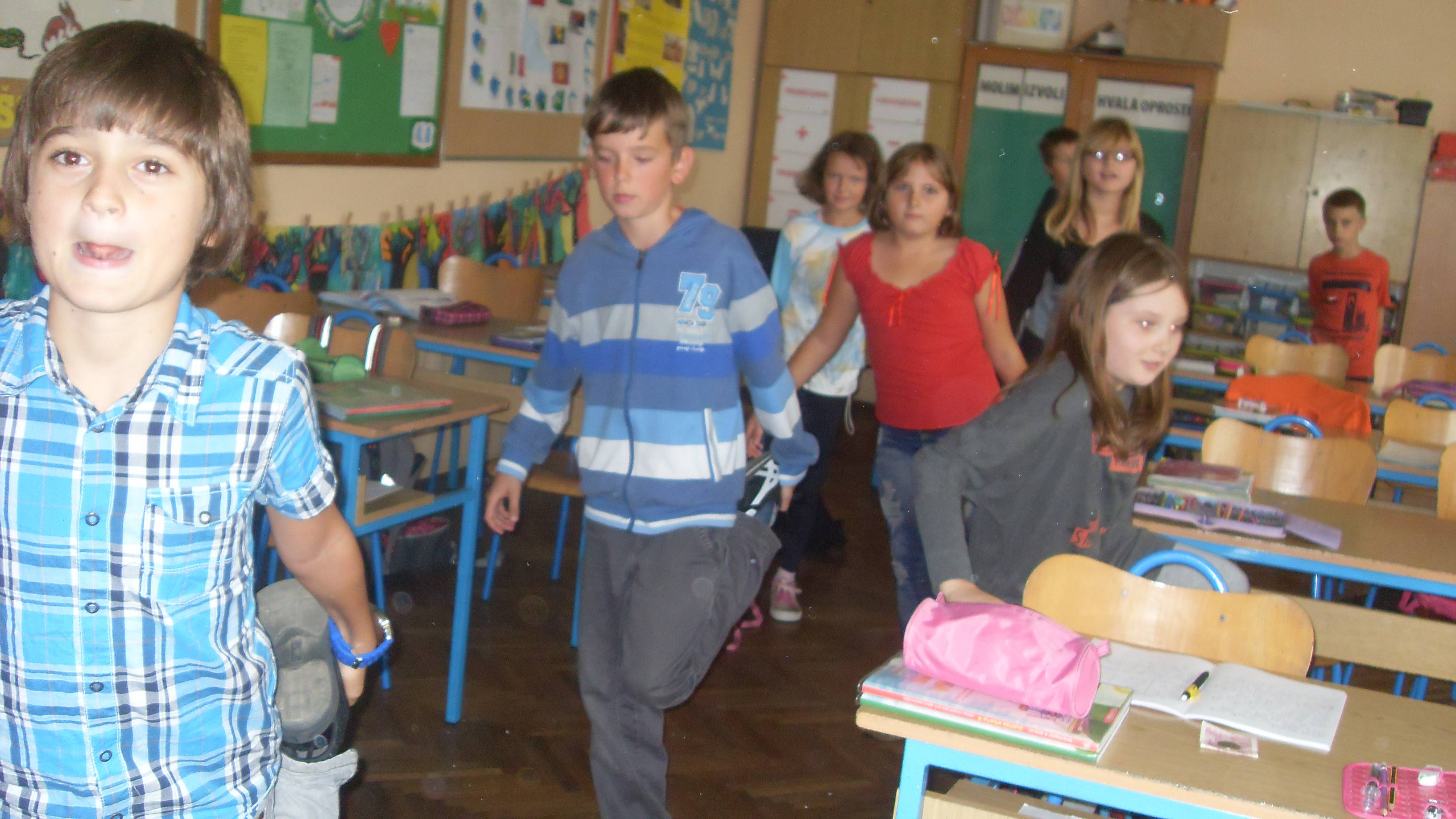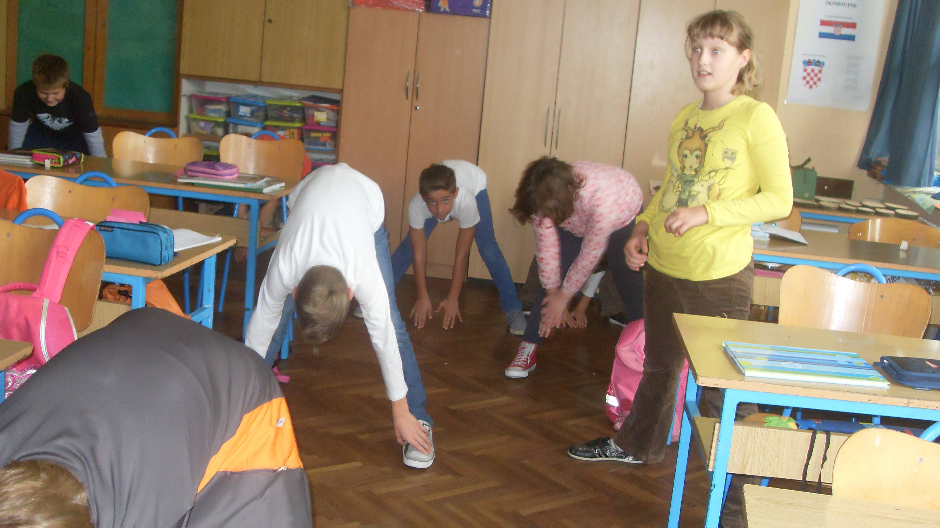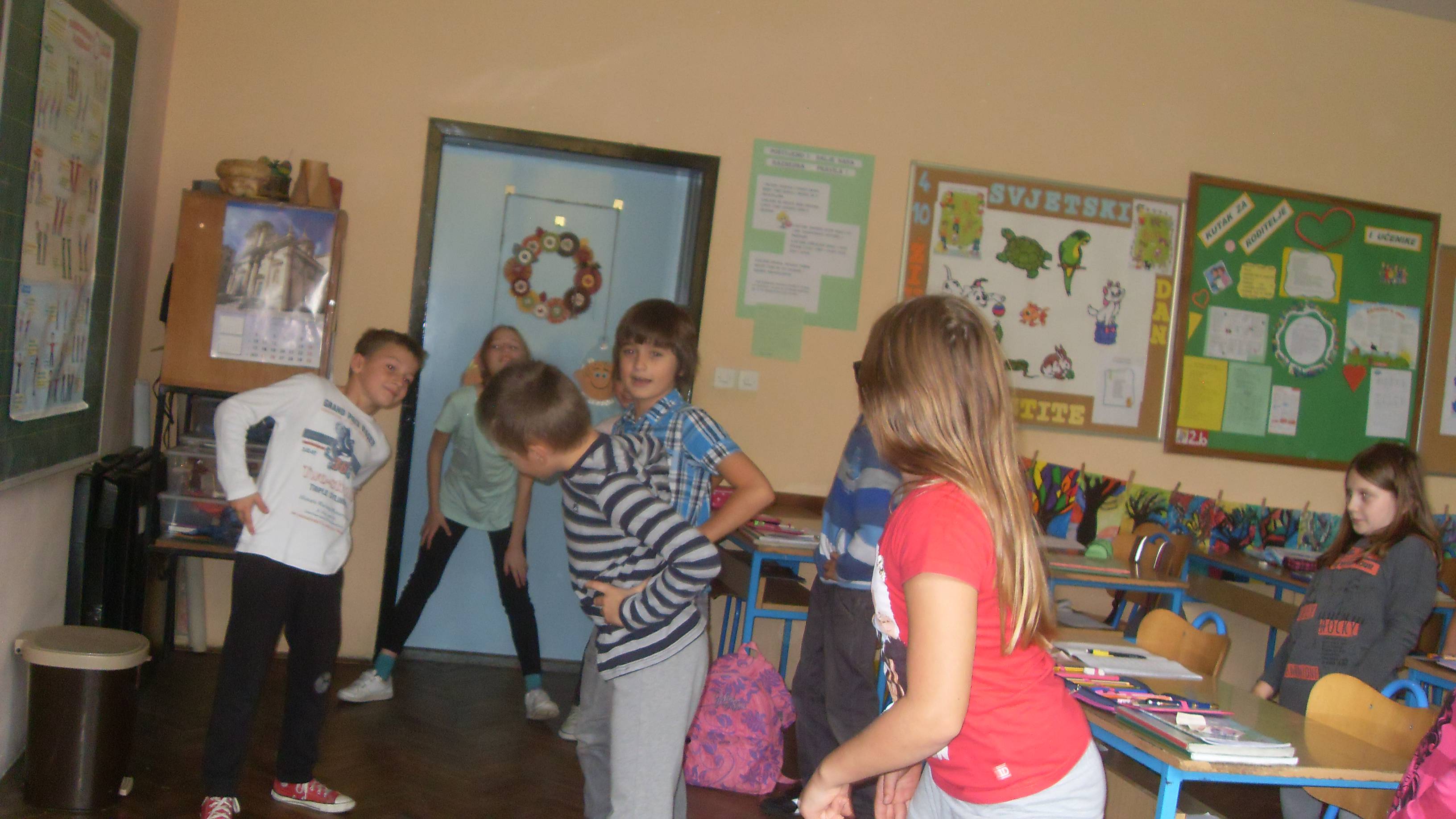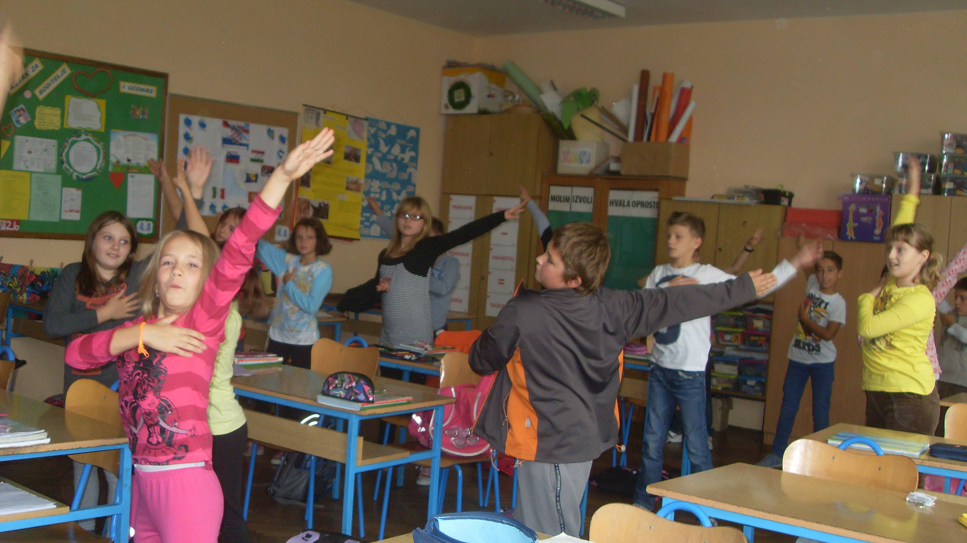 Svaki dan, jedan od nas stane pred pano, gdje su slike vježbi i pokazuje što i kako vježbati. Redovito ga prati cijeli razred pod izrekom VOLIM SE GIBAT, GIBAT!