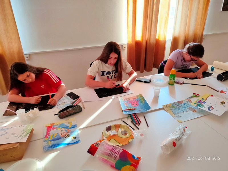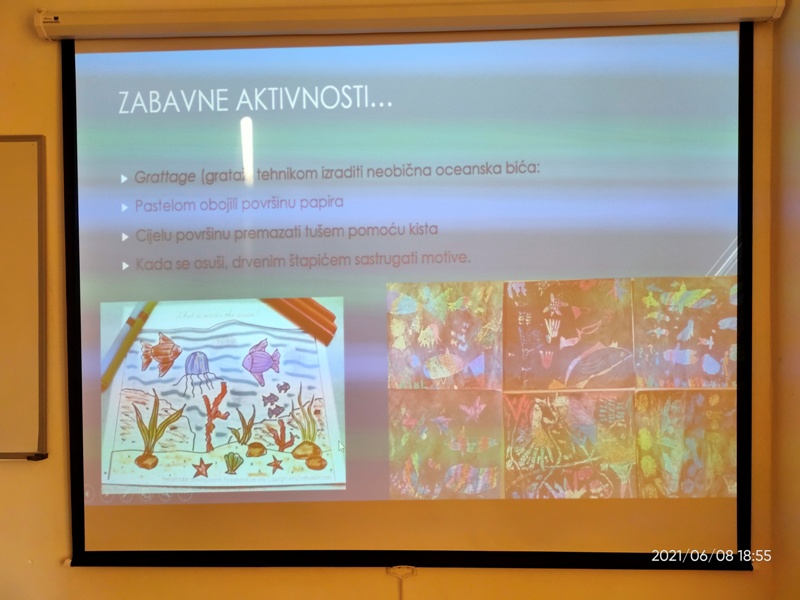 Učenice multimedijalne grupe „MultiGenijalci“ raspravljale se o važnosti oceana za život svih živih bića, posljedicama ljudskog nemara te saznale više o mikroplastici i što svatko od nas može učiniti za očuvanje obale, mora i podmorja. Pogledali su edukativne videozapise, proučavali simbole i znakove na ambalažama, a potom su na radionici pomoću grataž (grattage) tehnike prikazivali podmorje. Nakon toga su rješavali poučne kvizove i izrađivali akvarije pritom reciklirajući kutije i plastične tanjure.
