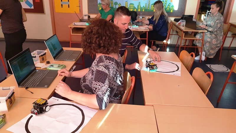Na edukaciju su pozvani mentori iz Gradca, Makarske, Staševice, Vrgorca… Učiteljica informatike Dona Prović i školski knjižničar Mario prisustvovali su edukaciji, upoznali se s micro:Maqueen Plus robotom, njegovim komponentama i senzorima. Naučili su se koristi potrebnom aplikacijom unutar koje su izradili programe za robot te saznali proces provedbe robotičkih natjecanja u sklopu Croatian Makers lige.
