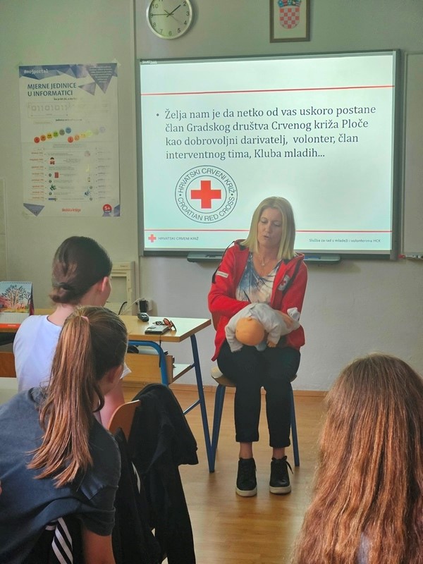 Vrijedne djelatnice Crvenog križa Ploče, kojima se ovim putem zahvaljujemo, odazvale su se na poziv učiteljice geografije Monike Bušurelo i učiteljice informatike Done Prović te su posjetile našu školu i održale predavanje i radionicu u sklopu projekta „Edukacijom do samosvjesnog pojedinca“.
