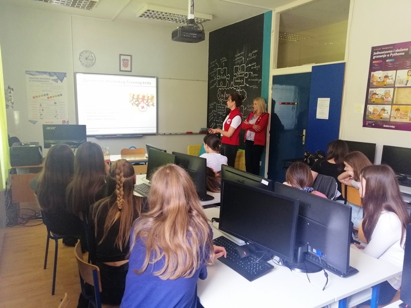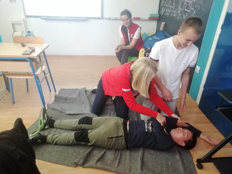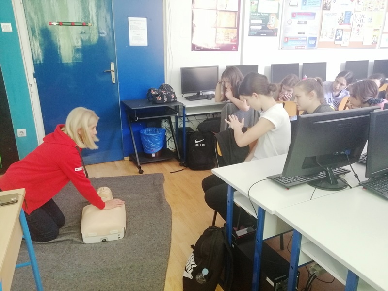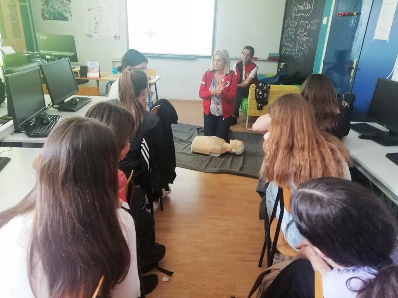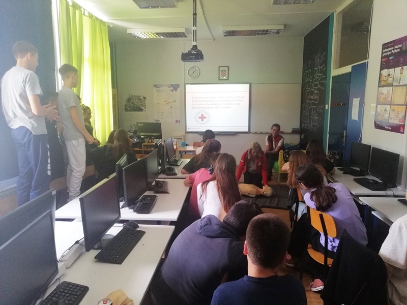 Prezentaciju o povijesti i brojnim aktivnostima Crvenog križa, a potom i radionicu u kojoj se moglo naučiti kako pomoći unesrećenom do dolaska hitne medicinske službe, održale su učenicima 7. razreda, koji su sudjelovali u demonstraciji te su pokazali velik interes za radionicu.