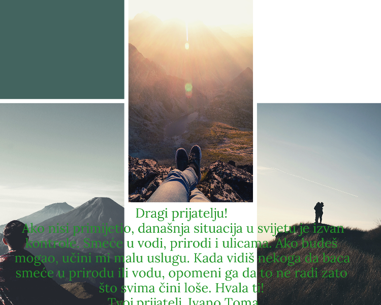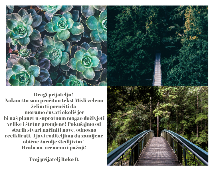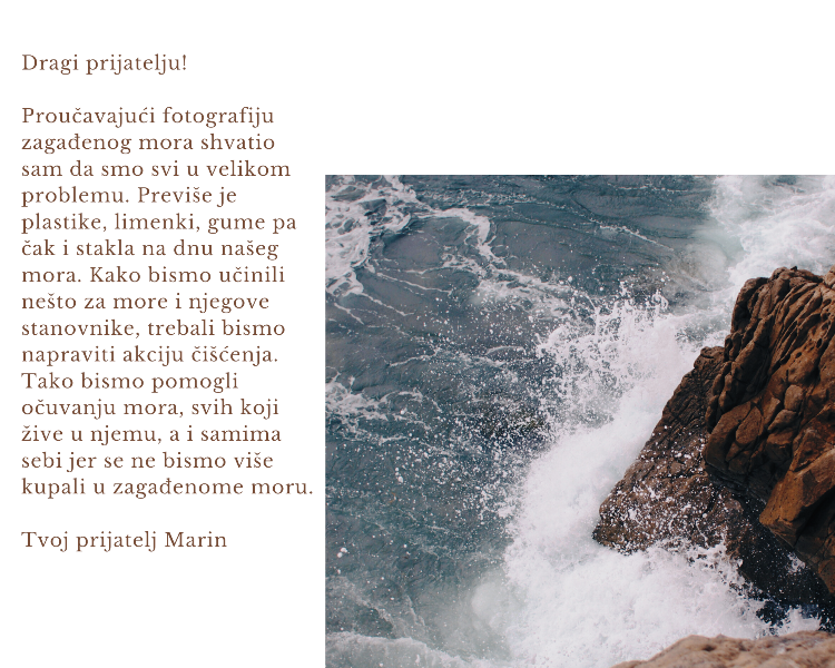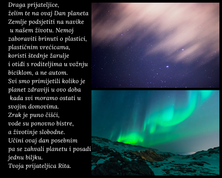 Brojnim aktivnostima učenici su obilježili ovogodišnji jubilarni 50. Dan planeta Zemlje. Učenici šestih razreda, s predmetnom učiteljicom Ivanom, pisali su svojim prijateljima pisma upozorenja kojima su htjeli ukazati na potrebu promjene razmišljanja i ponašanja prema prirodi.