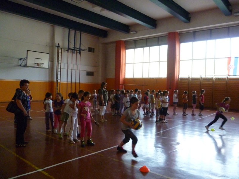 U školskoj dvorani se osjećao natjecateljski duh... Učenici četvrtih razreda (po pet učenika) su se natjecali u biciklijadi. U 9 sati su učenici prvih razreda igrali štafetne igre, zatim su učenici drugih razreda igrali igru Lopta kroz noge, treći razredi su se natjecali u skakanju u vrećama, dok su učenici viših razreda imali nogometni turnir.