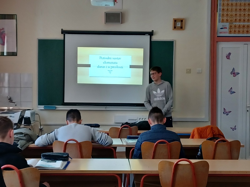 Naša škola ove godine obilježava 70 godina postojanja. Tim povodom učenici 7.b razreda i predmetna učiteljica kemije Žana Govorko razgovarali su o povijesti Periodnog sustava elemenata, o tome kako je on izgledao na samom početku svog nastajanja davne 1869. godine, ali i kako je izgledao i koje je simbole kemijskih elemenata sadržavao prije točno 70 godina kada je naša škola nastala.
