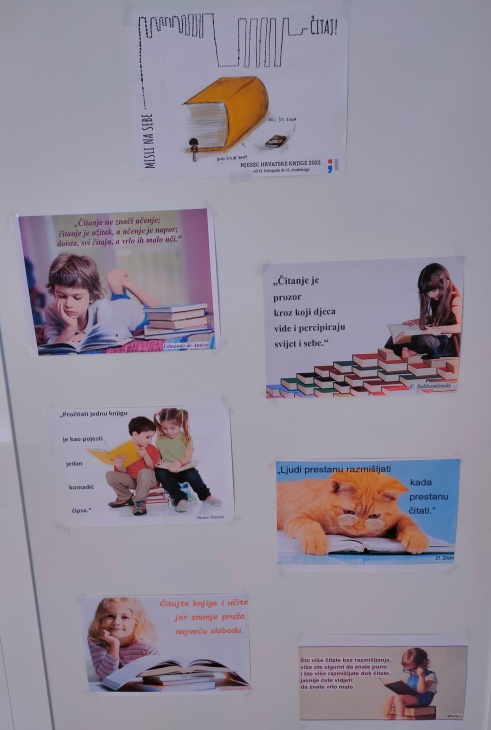 Danas se obilježava Dan hrvatskih knjižnica koji je dio obilježavanja Mjeseca hrvatske knjige. Učenici 6. razreda Daniel, Nina i Deniz su uz podršku knjižničara izradili plakat na temu knjiga i knjižnica. Naučili smo neke zanimljivosti iz svijeta knjige kao što su: Koje su najčitanije knjige svih vremena, koja je najmanja knjiga, koja je najstarija knjiga, koji je najveći iznos koji je plaćen kao dug (zakasnina) za nevraćenu knjigu (350$!). Spomenuli smo i najvažniju i najveću knjižnicu u RH - NSK! Geslo Dana hrvatskih knjižnica 2022. je "Misli na sebe – dođi u knjižnicu!."