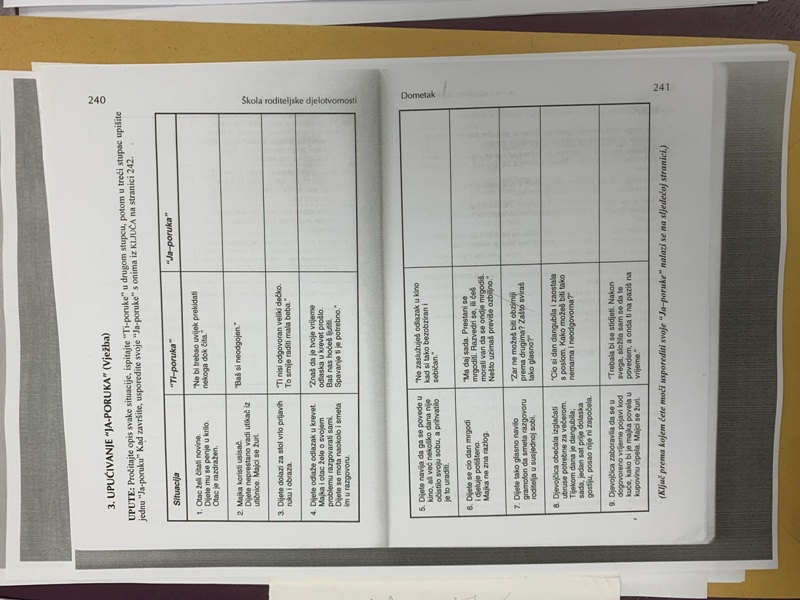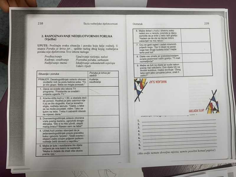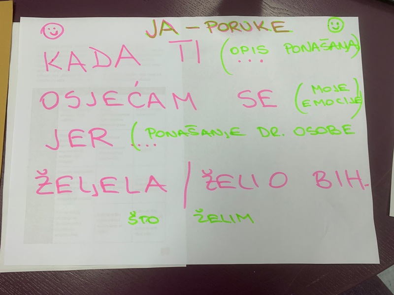 Kroz mjesec studeninastavio se ciklus radionica u Osnovnoj školi Vladimir Nazor Ploče. Održana je peta radionica pod nazivom „Komunikacija ( ja – poruke)“. Roditelji su pogledali prezentaciju o „Ja – porukama“ te naučili formulu sastavljanja takvih rečenica. Nakon prikazane prezentacije ispunili su vježbu gdje su ponuđene rečenice (situacije) prilagodili „Ja – porukama“ te su također ispunili vježbu gdje je trebalo raspoznati nedjelotvorne poruke. Zaključno, naučili su svoje uobičajene reakcije zamijeniti „Ja – porukama“ te si time olakšati rješavanje izazova u odgoju.