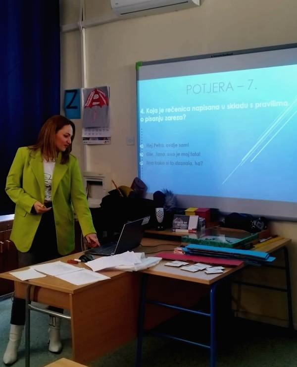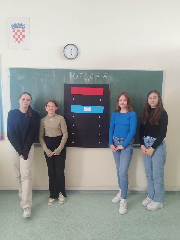 Mjesec hrvatskog jezika završili smo svima zanimljivim kvizom – Potjerom. Članovi tima Jezikoznalci hrabro su se součili s lovcem izazivačem. U prvom izdanju naše školske „Potjere“, na oduševljenje cijele publike lovac je bio naš knjižničar Mario. Neizvjesno je bilo do samoga kraja. Publika je energično bodrila sve natjecatelje koji su pokazali zavidno znanje materinskog jezika. Kao i u televizijskoj Potjeri, i ovdje je bilo prisutno malo treme koja ipak nije omela natjecatelje da ostvare željeni cilj – pobjedu! Iako je pobjeda bila tijesna „Jezikoznalci“ su zasluženo osvojili poklon bon kojim će se počastiti. Ostali svi željeno iščekujemo slijedeće ovog zanimljivog kviza. Ponosni smo što je ostvarena još jedna uspješna suradnja sa školskim knjižničarom.