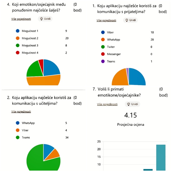 Učenici su kao uvod u aktivnost rješavali digitalnu anketu čiji su nam rezultati bili poticaj za razgovor o virtualnoj komunikaciji. U ovoj smo se radionici usmjerili na dopisivanje u popularnim virtualnim grupama i službenim školskim komunikacijskim kanalima. Rezultati ankete pokazali su kako je WhatsApp najčešće korištena aplikacija za vršnjačku komunikaciju, a Teams prikladniji za komunikaciju s učiteljima. Gotovo svi učenici prilikom vršnjačkog dopisivanja koriste ikone osjećaja, tzv. emotikone/osjećajnike i dobro poznaju značenje učestalih osjećajnika, ali nisu baš uvijek sigurni u njihov odabir.
