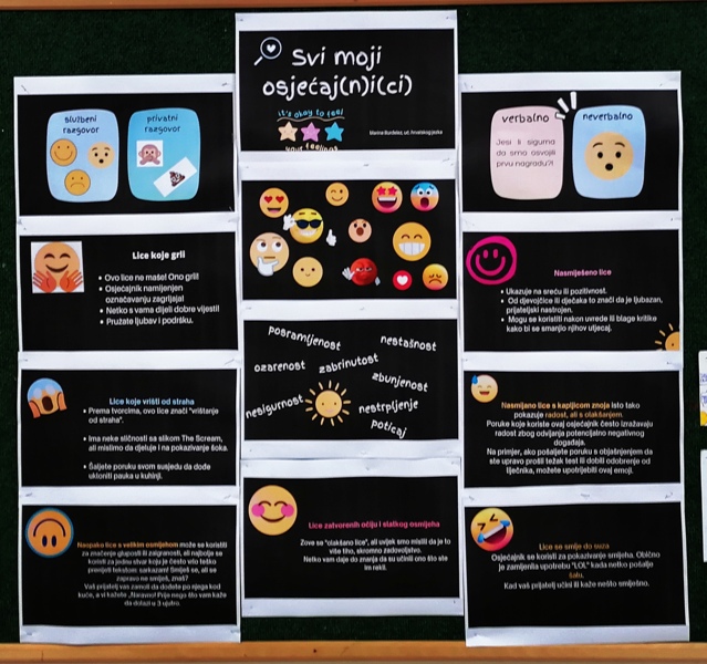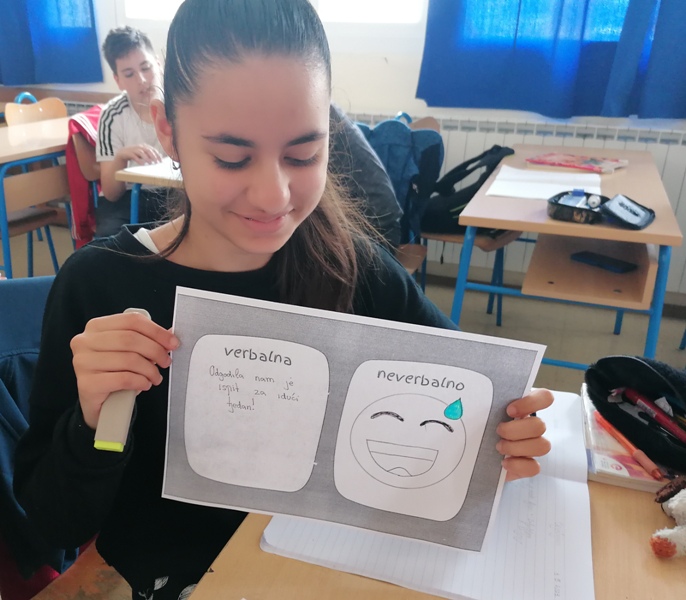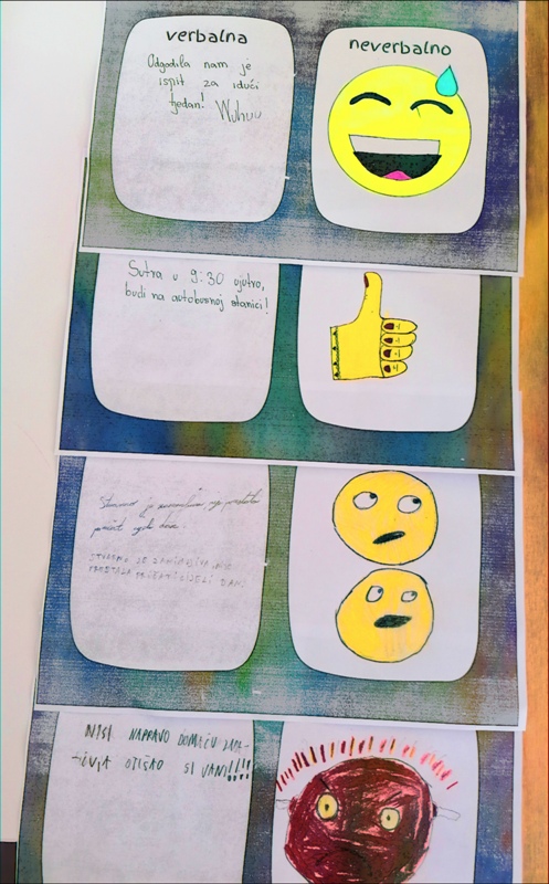 Nakon kratkog predavanja i razgovora o verbalnoj i neverbalnoj komunikaciji učenici su u grupama osmišljavali vlastite primjere te ih predstavljali jedni drugima. Proširili smo znanje o značenju najčešće korištenih osjećajnika te u suradničkoj aktivnosti odigrali igru spajalice sličice lica i njenog značenja. Učenici su rado dijelili vlastita iskustva i u improviziranim razgovorima ulazili u uloge pošiljatelja i primatelja poruka koje prenose različite emocije. Odgovor na pitanje je li moguće baš sve nijanse ljudskih osjećaja dočarati sličicom tražili smo u igri oživljavanja ponuđenih lica. Razgovarali smo i o kulturi verbalnog i neverbalnog virtualnog dopisivanje. Učenici su s lakoćom prepoznali koji emotikoni nisu primjereni službenoj komunikaciji.