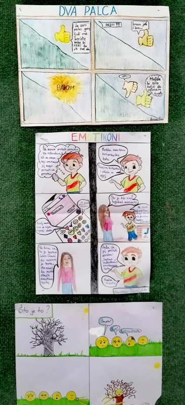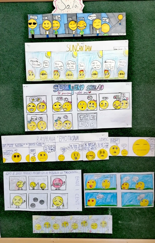 Stečene spoznaje na kreativan način učenici su povezali s nastavom predmeta Hrvatski jezik izrađujući stripove čiji su likovi sličice omiljenih žutih lica, a tema njihovo značenje.