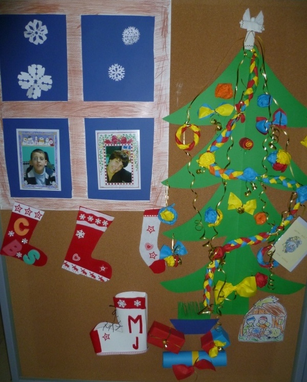 Rađeno je, kako moja učiteljica kaže, tehnikom gužvanja. A vjerujte mi ja sam majstor u toj tehnici. Dakle najteži dio posla sam ja napravio. Zgužvao sam pak papira dok je učiteljica vrijedno plela i lijepila ukrase na našu jelku od papira. I prozor sam pomogao obojiti. A jako je veliki. Učiteljica mi je silikonskim ljepilom obrubila sliku naše štalice i ja sam je sam obojio. To je velika stvar. Ostatak ukrasa je izradila učiteljica naravno uz moju pomoć. Vrh našeg drvca ukrasili smo anđelom kojeg smo kupili od naše časne sestre Helene i tako dali potporu siromašnoj djeci, a i lijepo nam je ukrasio drvce. Ovim putem želimo čestit Božić i sretnu Novu godinu svim djelatnicima.