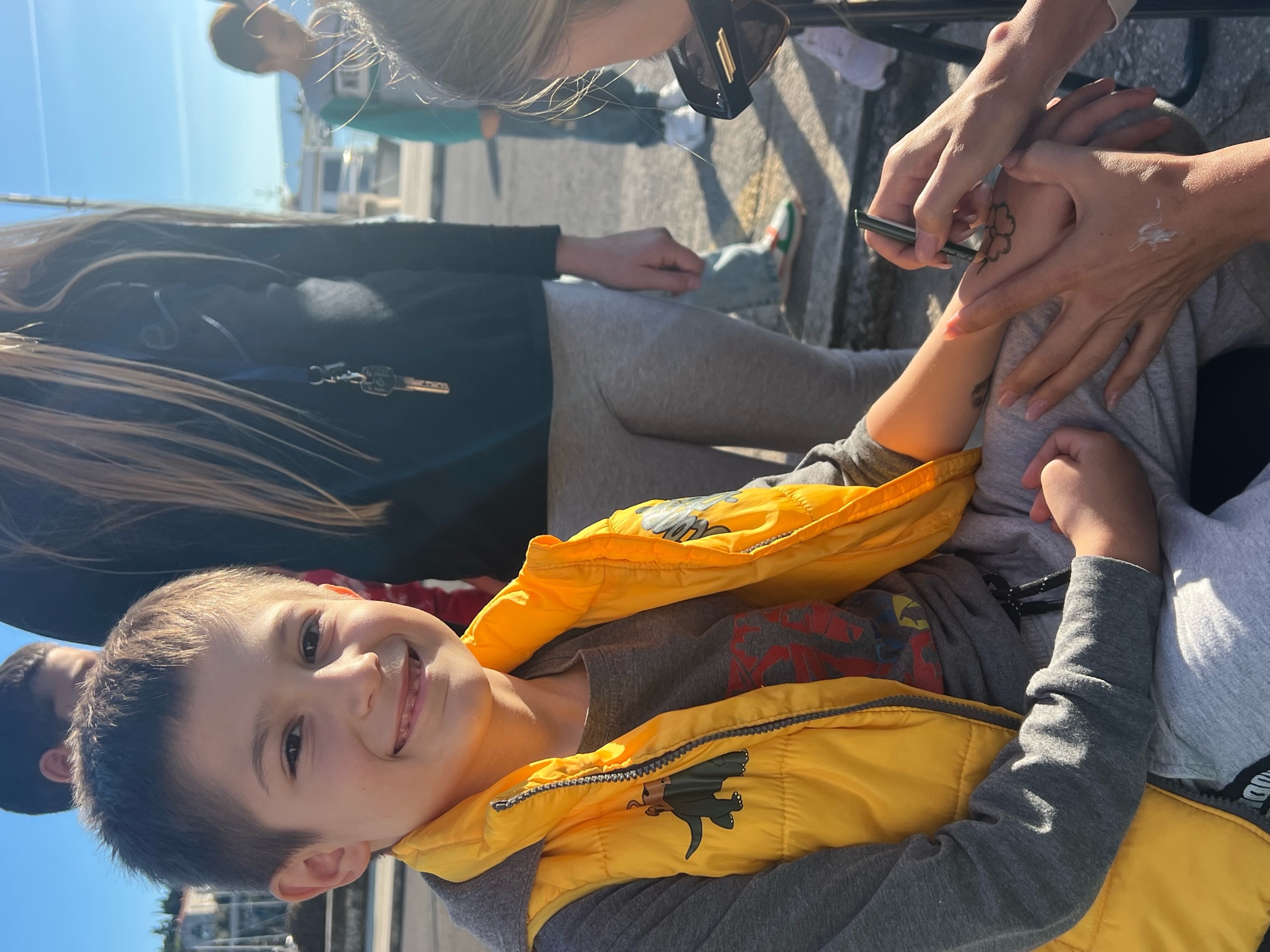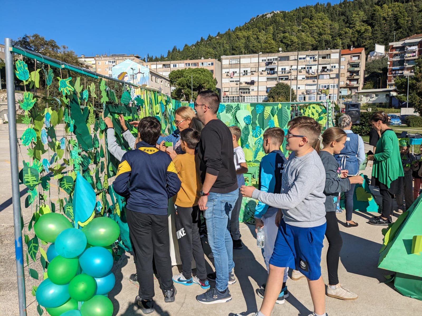 Nakon što smo prenijeli našu instalaciju na ciljanu lokaciju, našu su učenice zabavile mlađu djecu crtanjem zelenih listića po licu tzv.facepaintingom.
