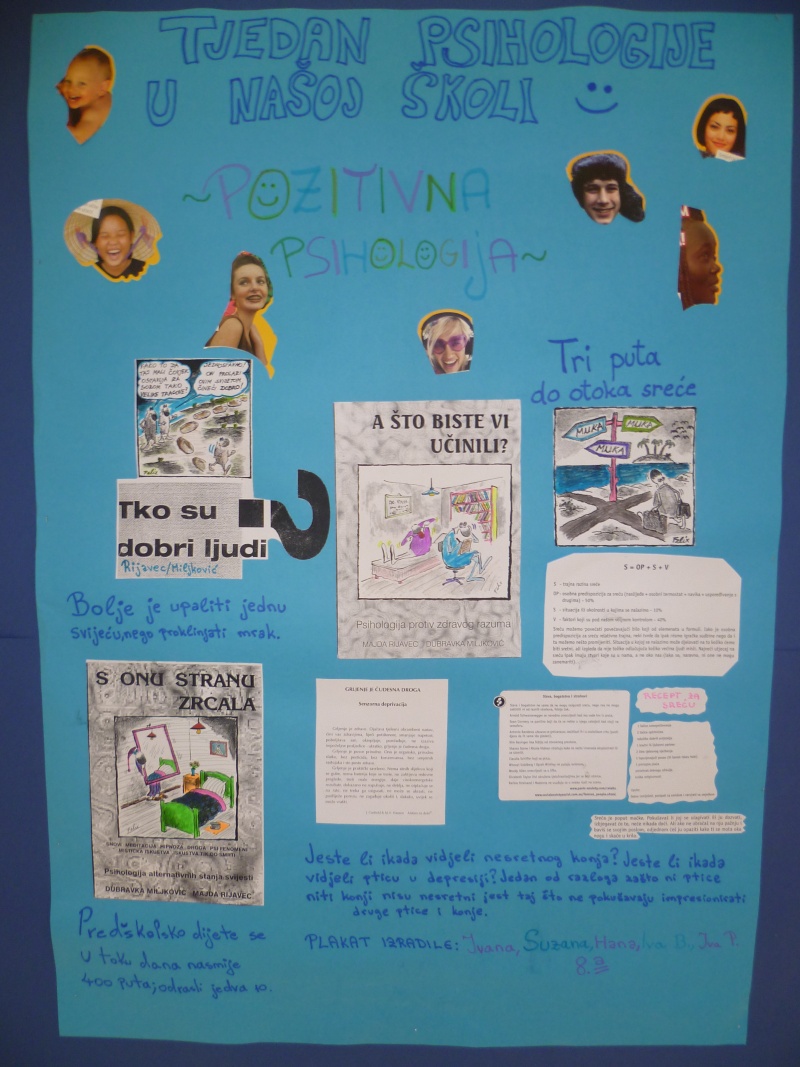 Sa učenicima 8. a (koji su u likovnoj sekciji) napraviti plakat koji će biti u holu škole o Tjednu psihologije i pozitivnoj psihologiji.