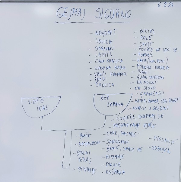 Za učenike 1.-4. razreda predviđena je radionica o alternativnim načinima igre, bez ekrana. Sjetili smo se čak 38 zabavnih igara koje se mogu igrati bez ekrana te ponovo naglasili da, prema zakonu, djeca mlađa od 13 godina ne bi smjela imati otvorene profile na društvenim mrežama ( Facebook, Instagram, Snapchat, Youtube, Tik-Tok...) jer nisu u stanju shvatiti sve opasnosti koje im nose društvene mreže. Sigurno gejmanje, van mreža, je puno zabavnije!