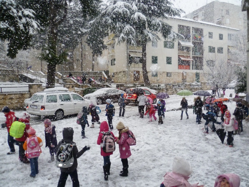 Pahuljice kao zvjezdice došle su iznenada. Djeca su se razveselila i brzo snjegovića napravila. Niz bijele ulice i stepenice odzvanjao je veseli smijeh. Dok je snijeg neumorno sipio, sipio, sipio…
