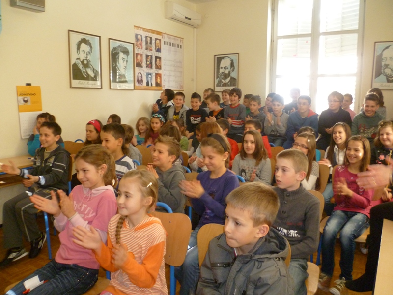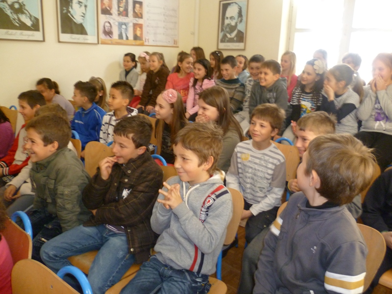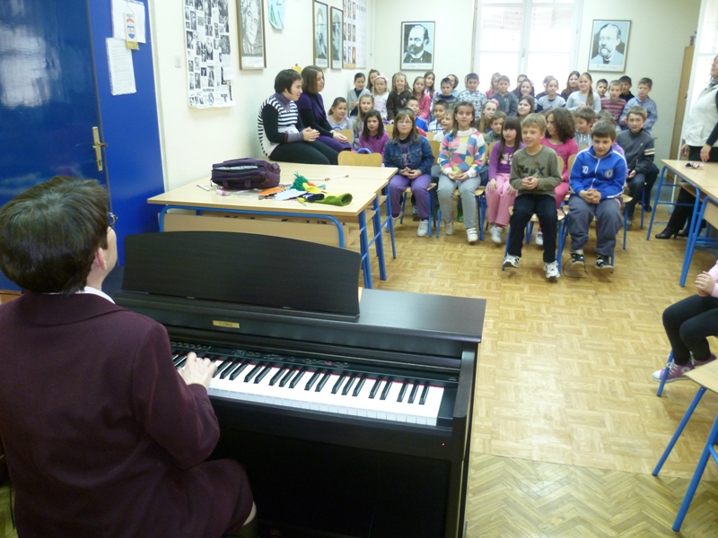 Susret je održan u glazbenom kabinetu. Pričanje priča književnica je popratila sviranjem na klaviru uz uporabu zanimljivih rekvizita. Druženje je završilo u veseloj i razigranoj atmosferi.