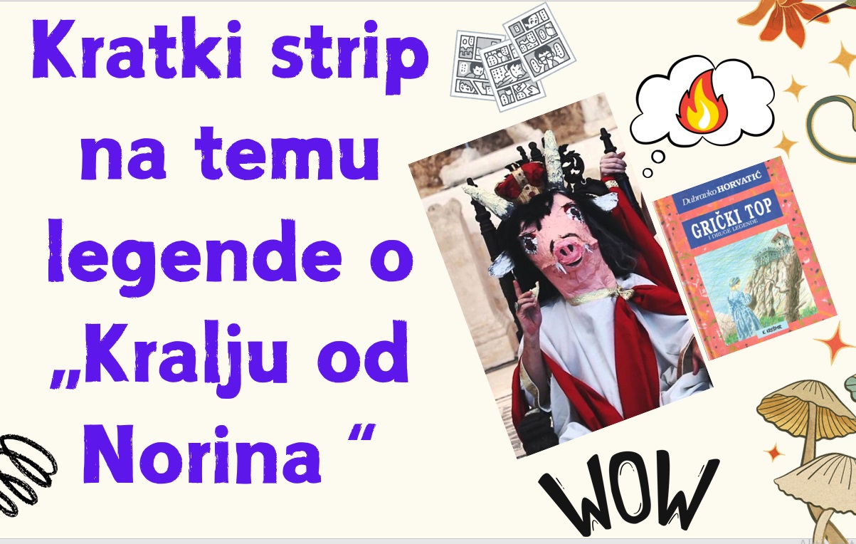 Kao što svi znamo slika govori više od riječi, dok je strip kombinacija i jednog i drugog elementa. Svoju kreativnost i doživljaj jedne od legendi iz knjige Grički top („Kralj od Norina“) predstavile su nam učenice Ema, Korina, Lara i Pia koristeći obrazac za izradu stripa. S obzirom da se radi o jako osebujnom liku neobična izgleda, učenice su se potrudile i na svoj originalan način prikazale lokalnu legendu. Hvala im na tome.