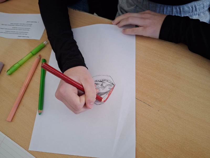 Radionicu smo započeli upoznavanjem s obilježjima pjesničkog jezika Petra Gudelja. Usredotočili smo se na motiv jezika i njegovu duboku povezanost sa zavičajem. Interpretirajući pjesmu Zemlja u jeziku, učenici su uočili jake riječi i škrti rječnik kao snažno obilježje poetskog jezika. Učenici su odabirali pjesničke slike koje su ih privukle, iskazivali dojmove i objašnjavali značenje. Pisali su vlastite pjesničke slike povezujući motiv jezika s karakterističnim zavičajnim riječima i izrađivali slikovne asocijacije odabranih pjesničkih slika.
