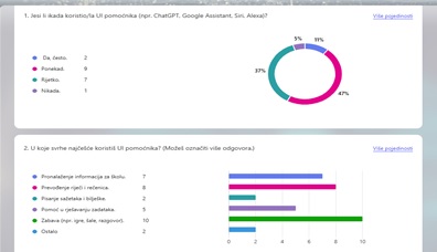 Proveli smo kratku digitalnu anketu o navikama korištenja umjetne inteligencije čiji su rezultati bili polazišna točka za osmišljavanje aktivnosti kojima bismo potaknuli kritičko vrednovanje UI pomoćnika.