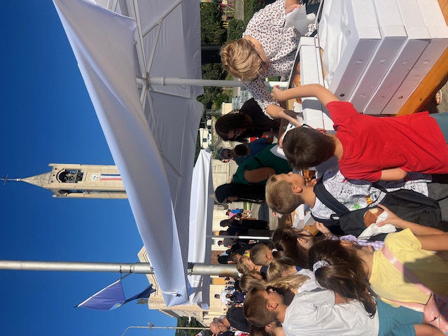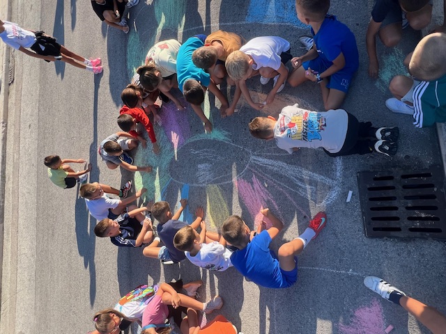 Istovremeno učenici razredne nastave na rivi ispred crkve u Pločama imali su sportsko i kreativno obilježavanje naših Malih bara. Učenici su bojali zadane motive na asfaltu i tako kreirali sliku. Pritom su formirali oblik koji je bio idealna podloga za našu milenijsku fotografiju snimljenu dronom. Nakon toga su slijedila sportska natjecanja u trčanju. Najbržim učenicima su dodijeljene medalje, ali i svi ostali učenici nagrađeni su sokovima i krafnama. Sretni u miru i ponosni na naše branitelje sjetili smo se još jednom kako su „velike Male bare“!
