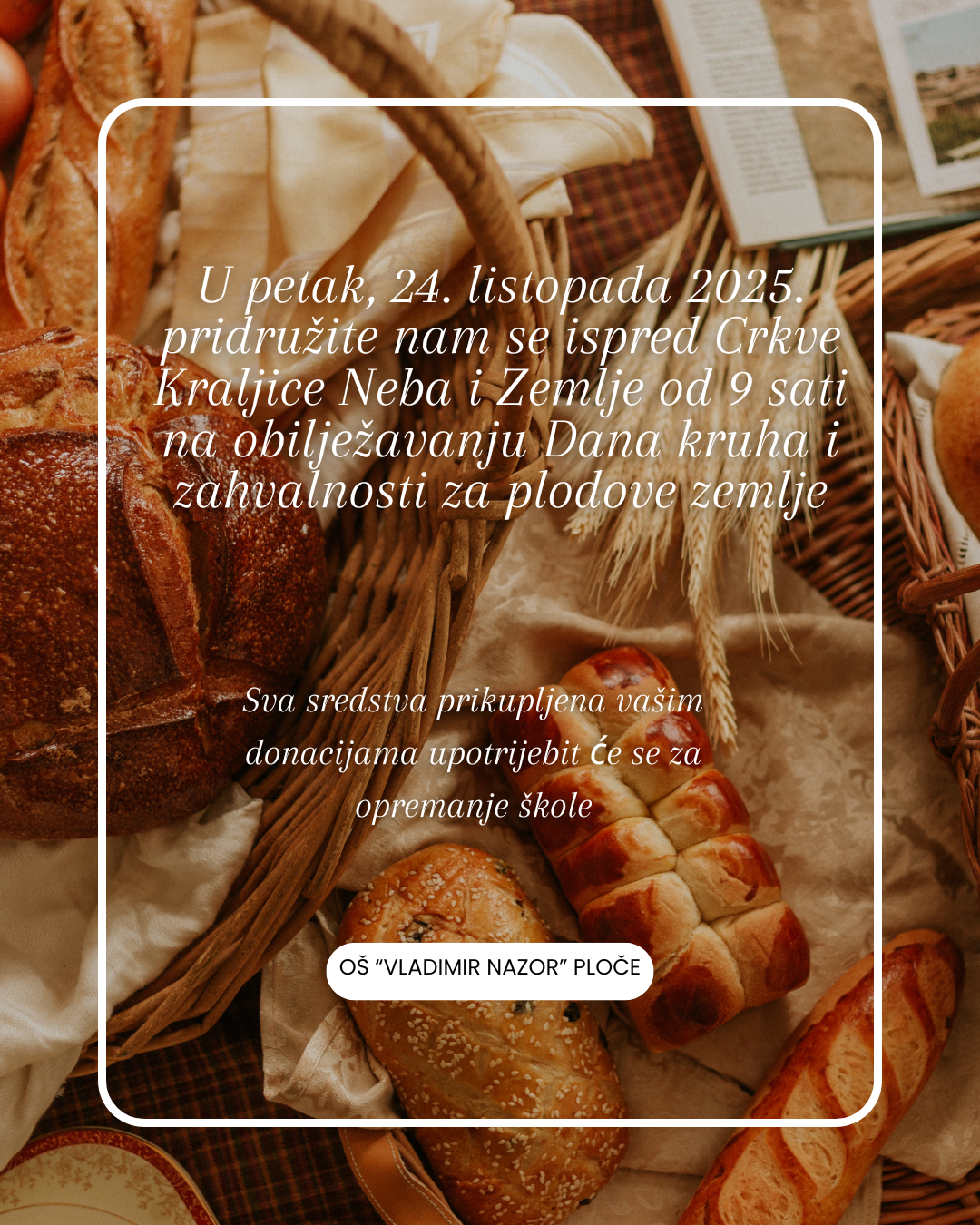 U petak, 24. listopada 2025. g., obilježit ćemo Dan kruha. Svečanost Dana kruha i zahvalnosti za plodove zemlje ćemo održati na platou ispred Crkve Kraljice Neba i Zemlje.