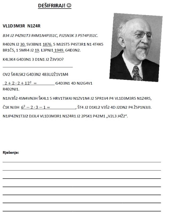 Djeca su u nizu zabavnih interaktivnih radionica prilagođenih njihovoj dobi rješavali matematičke zadatke i igrali igre temeljene na raznim matematičkim konceptima. Tako smo ove godine imali nekoliko online igara, matematički Alias, koordinatni Bingo i sl. Posebno, na kraju, dešifrirali smo tekst vezan za osobu čije ime naša Škola nosi i čiju 150-u obljetnicu rođenja ove godine obilježavamo - Vladimira Nazora.