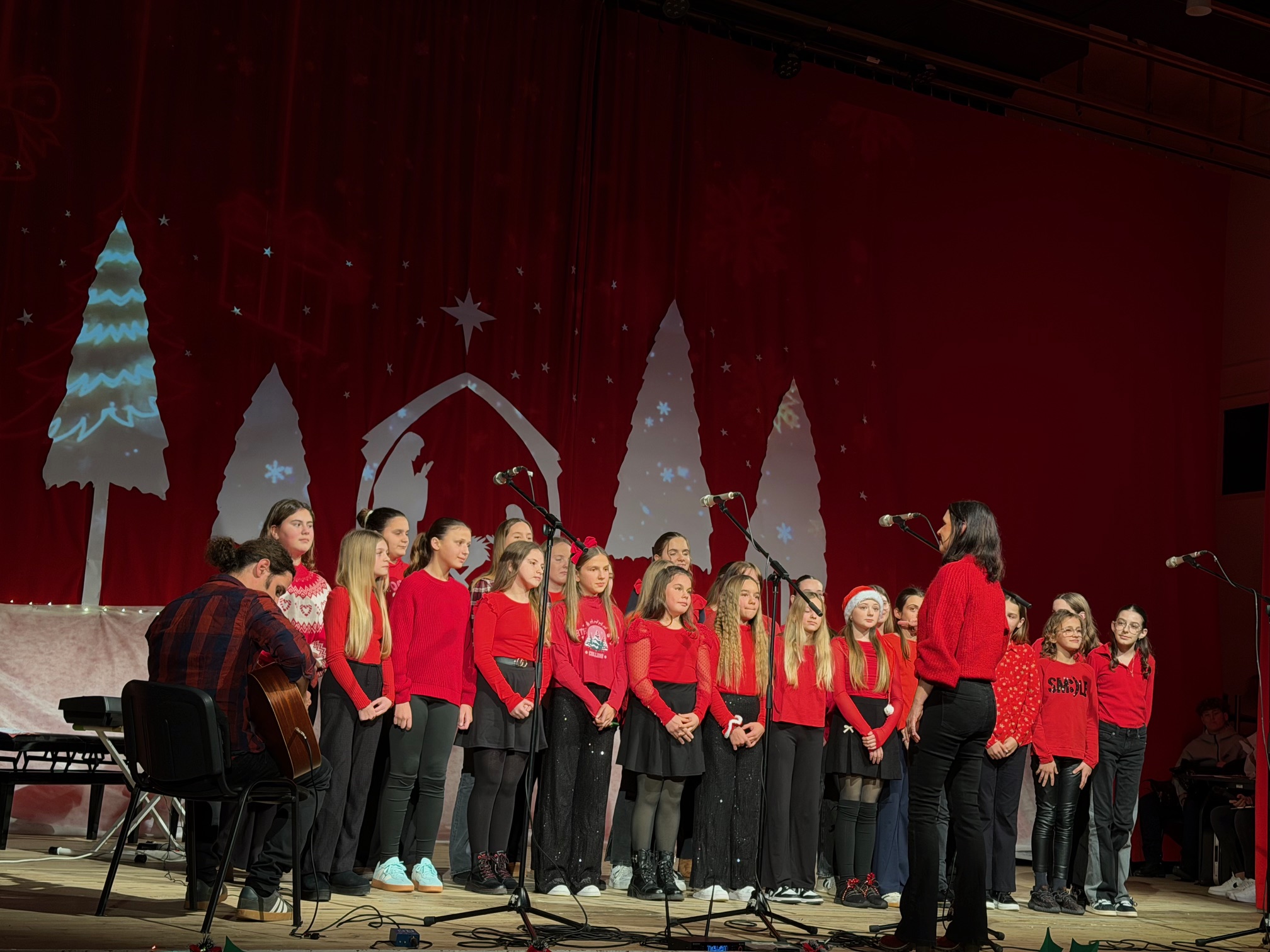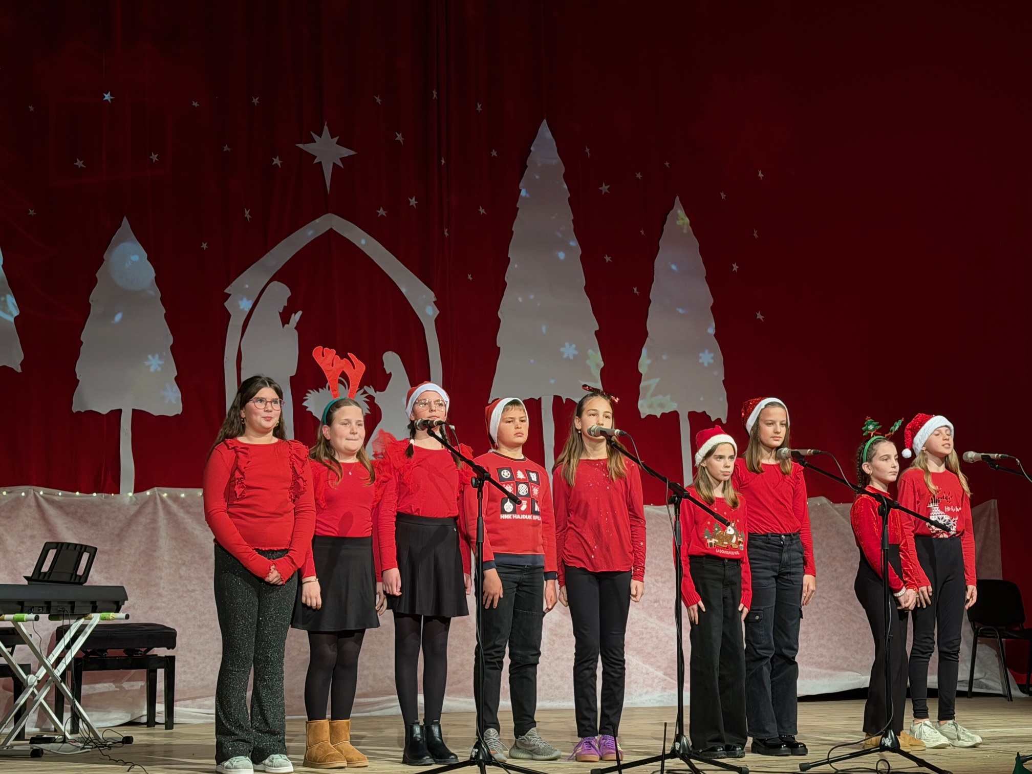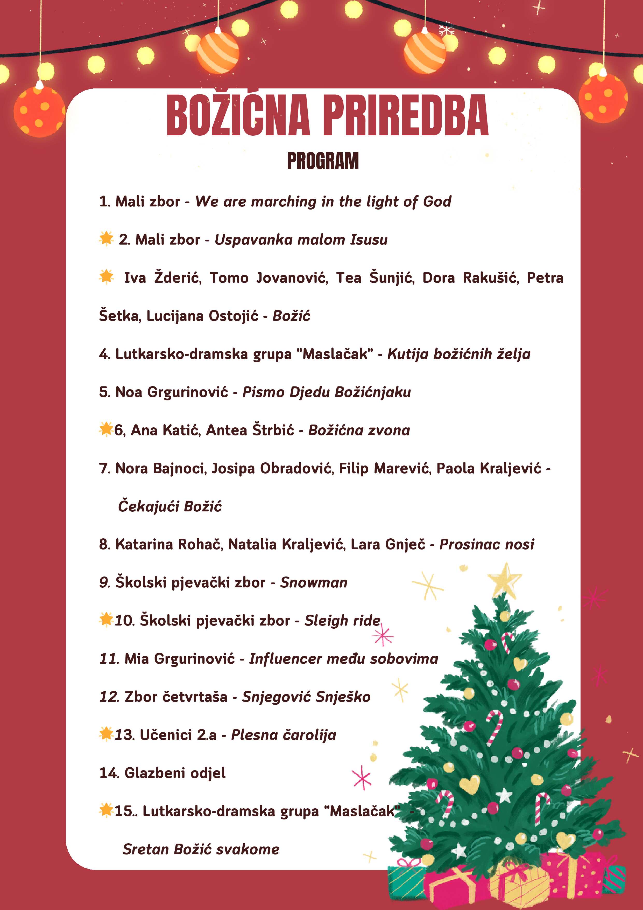 Publiku je nasmijao monolog Influencer među sobovima kojim je učenica Mia Grgurinović na duhovit način govorila o ovom vremenu darivanja. Kutiju božićnih želja - poučnu priču o tome kako najvrjedniji darovi nisu materijalni napisala je i izvela Lutkarsko-dramska grupa „Maslačak“, a zatim su plesnom točkom uz prigodnu pjesmu Sretan Božić svakome zabavili sve prisutne. Razigranim plesnim koracima otplesali su i učenici 2.a razreda svoju Plesnu čaroliju, a čarobne zvukove instrumenata pripremili su učenici i učitelji Glazbenog odjela naše škole. Pjesma je obogatila ovaj božićni program, a skladni glasovi našeg Školskog pjevačkog zbora i Zbora četvrtaša uz gitarsku pratnju Silvestra Ćavara podsjetili na važnost zajedništva i radosti tijekom blagdana.