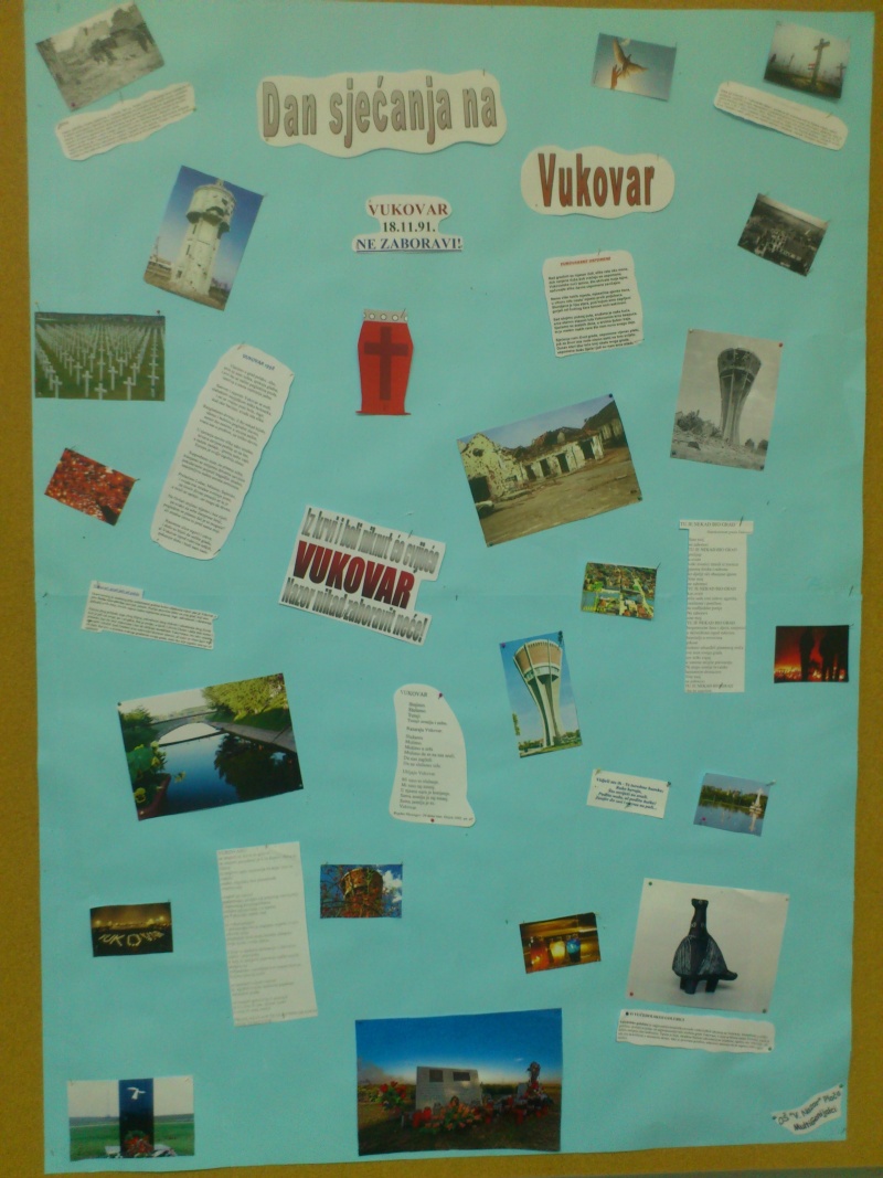 I školski hol je bio u ozračju sjećanja na stradanje Vukovara. Panoe koji su dočarali sve strahote Grada heroja izradili su učenici multimedijalne i likovne grupe.