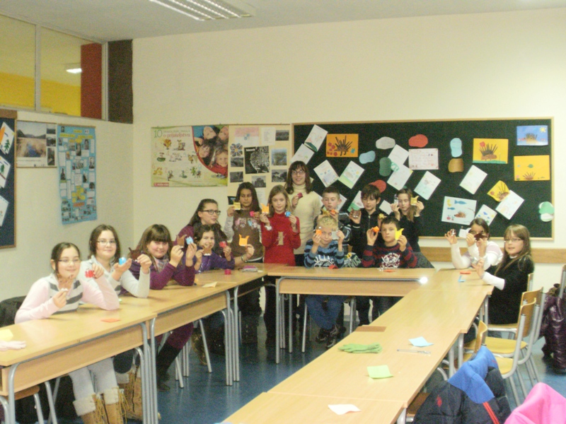 Origami radionice su održane u Školi 11. i 13. prosinca za učenike likovne sekcije iz 3.-ih i 4.-ih razreda. Radionice je vodila Tena Zmijarević iz Narodne knjižnice Ploče, koja je s velikim strpljenjem poučavala ovom zanimljivom modeliranju.