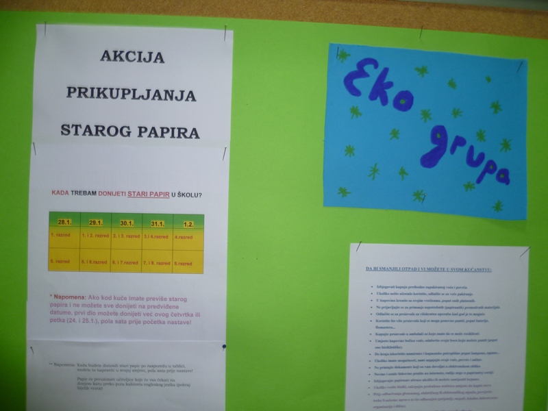 Druga akcija koju upravo pokrećemo je akcija prikupljanja starog papira. Želimo podići svijest najmlađih o značaju odvajanja otpada, te odvojenog sakupljanja papira kao korisne sirovine čijim se prikupljanjem čuvaju naše šume. Akcija prikupljanja starog papira u našoj školi kreće 28.1. i trajat će do 1.2., a odrađujemo je u suradnji s Unijapapirom iz Solina. Imate još dovoljno vremena kako biste kod kuće razvrstali stari papir koji vam više neće trebati (stare novine, bilježnice, reklamne letke…) od papira kojeg ćete još koristiti. Papir možete donositi u navedenom tjednu, prije prvog sata. Raspored za donošenje papira po razredima možete pronaći na oglasnoj ploči u školi. Zarađeni novac od prodaje starog papira koristit ćemo za nabavu školskog pribora za učenike slabijeg imovinskog stanja. Budući da i ova akcija ima natjecateljski karakter, potrebno je da papir zavežete špagom ili donesete u vrećicama, a mi ćemo ga izvagati i pratiti vaš napredak. Najuspješnijim učenicima i najuspješnijim školama u Hrvatskoj bit će uručene prigodne nagrade i priznanja.