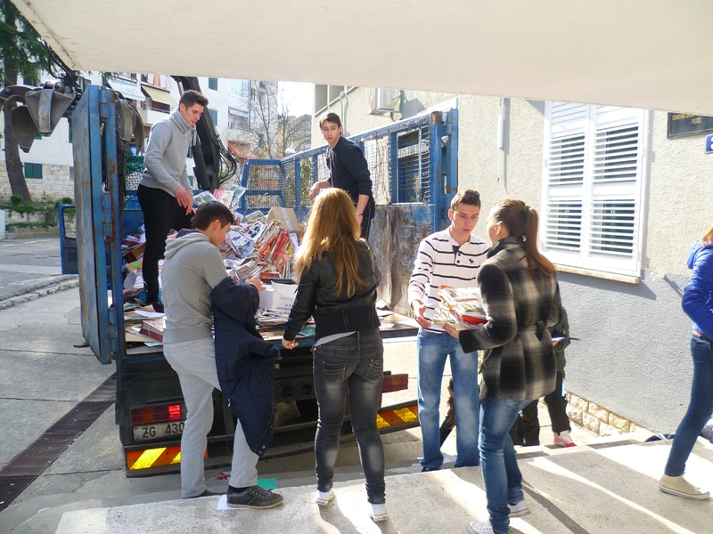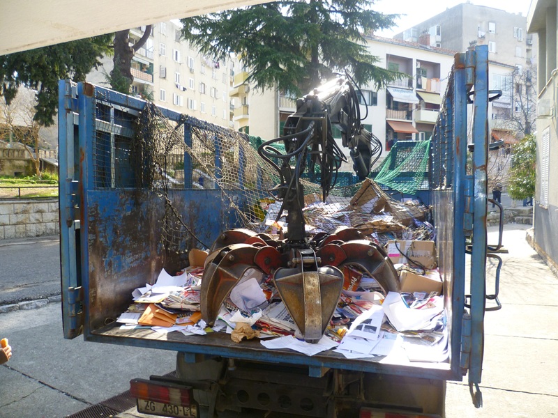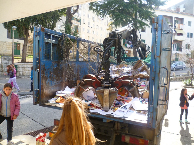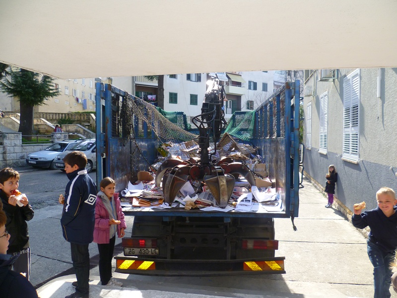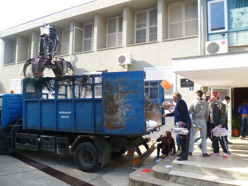 U utorak oko 9 sati ujutro, pred školu je stigao kamion tvrtke Unijapapir iz Solina i odveo papir na recikliranje. Našem domaru tada su pomagali i neki bivši učenici naše škole, pa ovim putem i njima zahvaljujemo! Kako kaže naša ravnateljica: „Sve je bilo gotovo u 5 minuta!“.