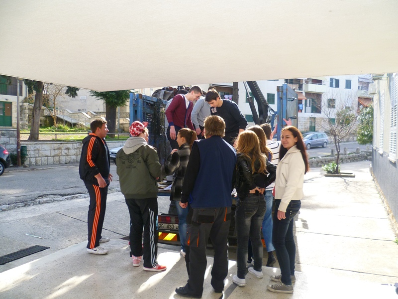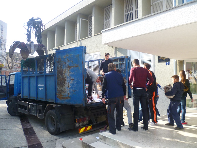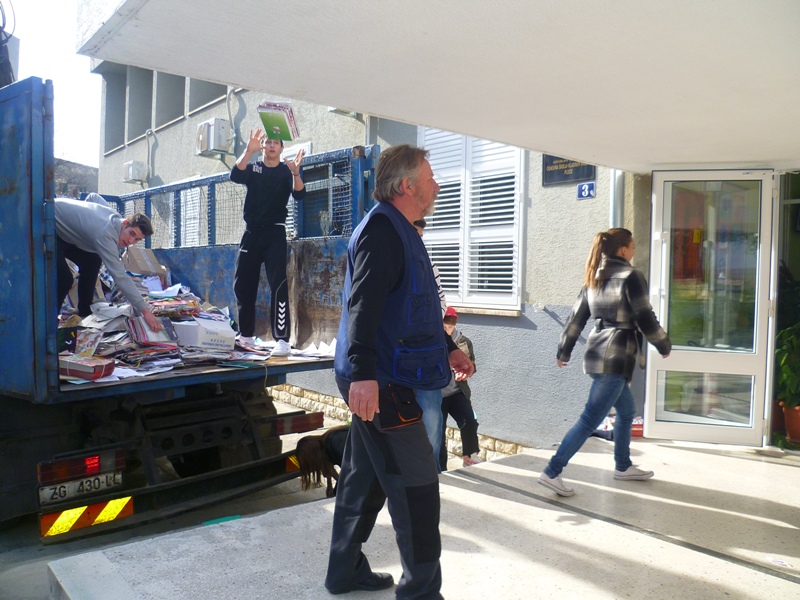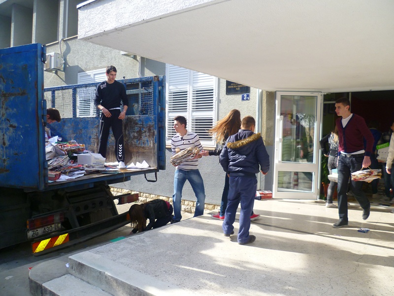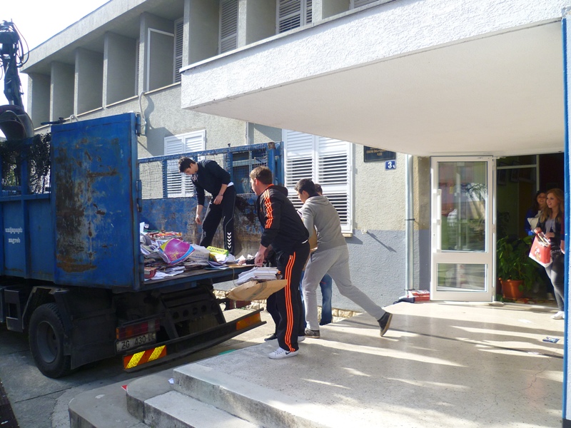Ovog ponedjeljka u poslijepodnevnoj smjeni, ogroman posao su odradili pojedini učenici 8.a i 8.c, koji su prikupljeni papir prenijeli od arhiva do ulaznih vrata škole, kako bi bio spreman za utovar. Uz dosta šale, nešto znoja, malo zanovijetanja i par šeprtljavih poteza, sve je bilo gotovo za nepunih sat vremena, tako da smo sami sebe iznenadili i neko vrijeme u nevjerici promatrali hrpu starog papira. Umor smo osjećali tek kasnije, ali veliko zadovoljstvo zbog obavljenog posla je na kraju prevladalo!