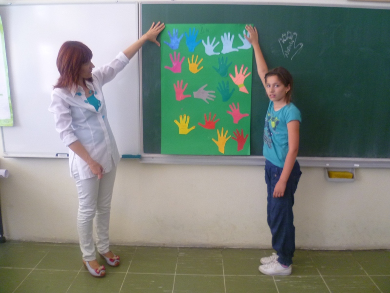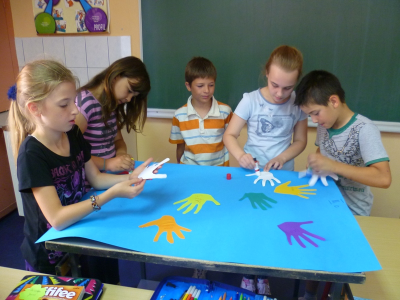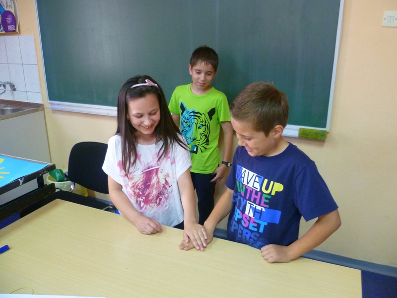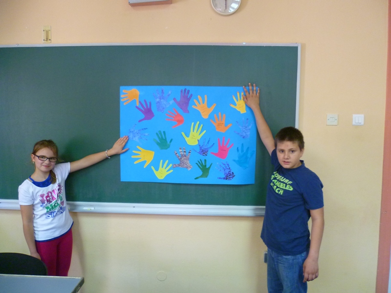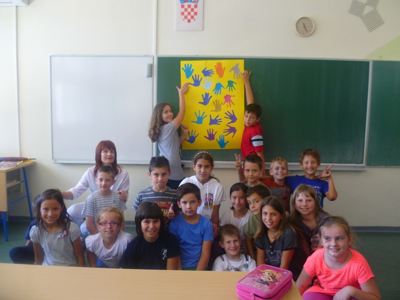 Učenici su pisali razrednu pjesmu. Na hamer su nalijepili svoje nacrtane dlanove od kolaž papira, te napisali svoje ime. Igrali smo igre „izvuci dlan koji je ostao zadnji“.