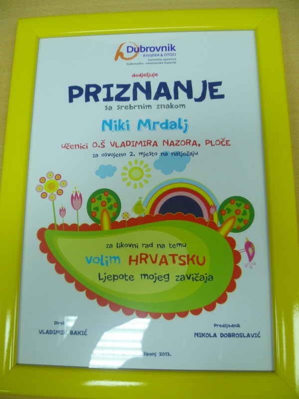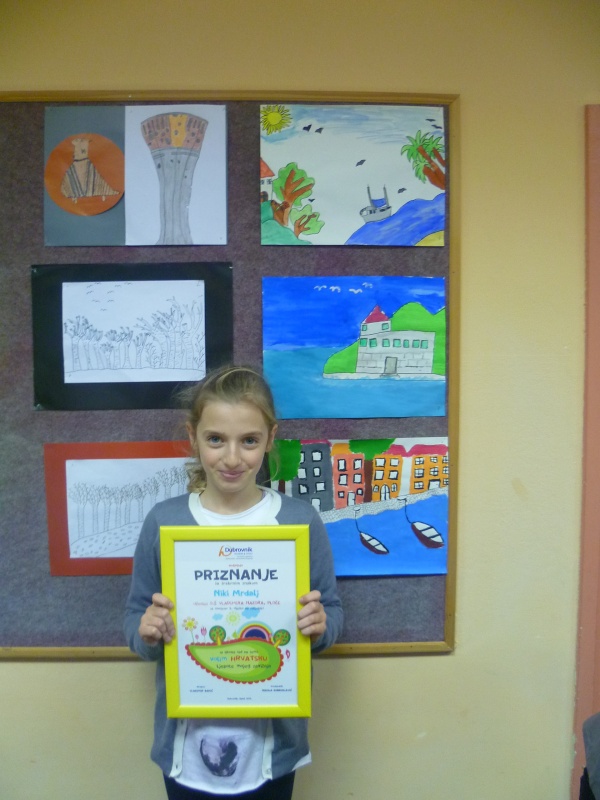 Član skupštine Turističke zajednice Dubrovačko-neretvanske županije, gospodin Ante Štrbić Fulin uručio je priznanje za osvojeno 2. mjesto učenici IV. c razreda Niki Mrdalj i njezinoj mentorici Nadi Ivanković za likovni rad na temu VOLIM HRVATSKU – Ljepote mojeg zavičaja, te novčanu nagradu u iznosu od 3.000,00 kn.