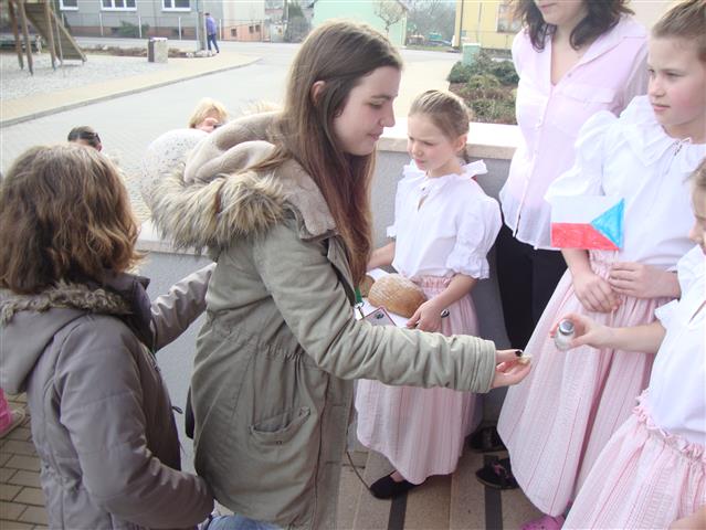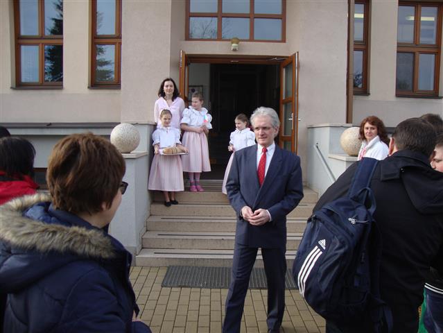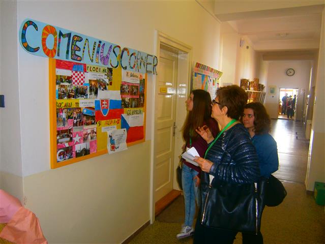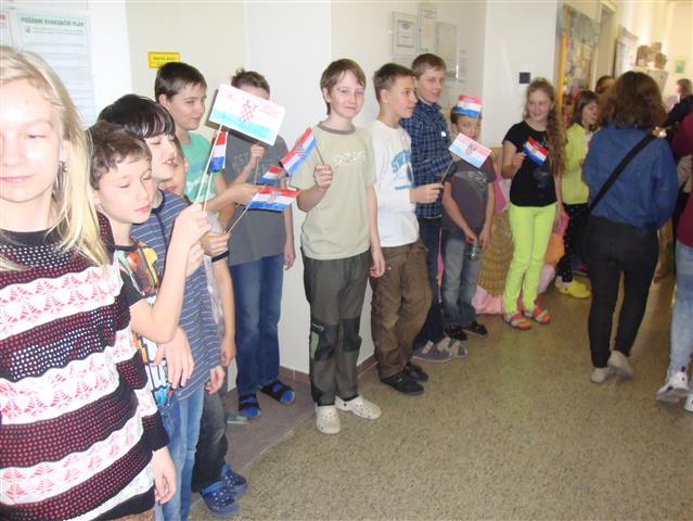 U ponedjeljak ujutro pred školom su po starom i nama znanom slavenskom običaju djevojčice goste dočekale kruhom i solju, a školski hodnici, sa dvostrukim špalirom radosnih lica, zastavama svih zemalja partnera i uzbuđenim pozdravima na engleskom jeziku, doveli su nas do dvorane pripremljene za svečani doček.