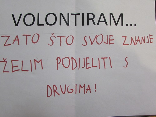 Učenici volonteri naše škole uistinu su bili vrijedni posljednjih mjeseci. Svaki drugi tjedan okupljali su se u prostorijama naše škole i pomagali su svojim prijateljima i kolegama. Školski tim nastavnika volontera je s njima održao sastanak te su dogovorene daljnje aktivnosti. Učenici su dobili i volonterske iskaznice.