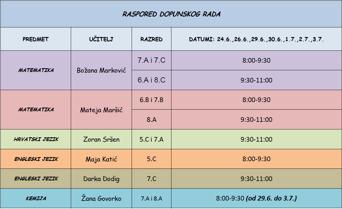 Sukladno članku 75. Zakona o odgoju i obrazovanju u osnovnoj i srednjoj školi („Narodne novine“ br. 87/08, 86/09, 92/10, 105/10, 90/11, 16/12, 86/12, 94/13 i 152/14) za učenika koji na kraju nastavne godine ima ocjenu nedovoljan (1) iz najviše dva nastavna predmeta, škola je dužna organizirati pomoć u učenju i nadoknađivanju znanja kroz dopunski rad koji je učenik dužan pohađati.