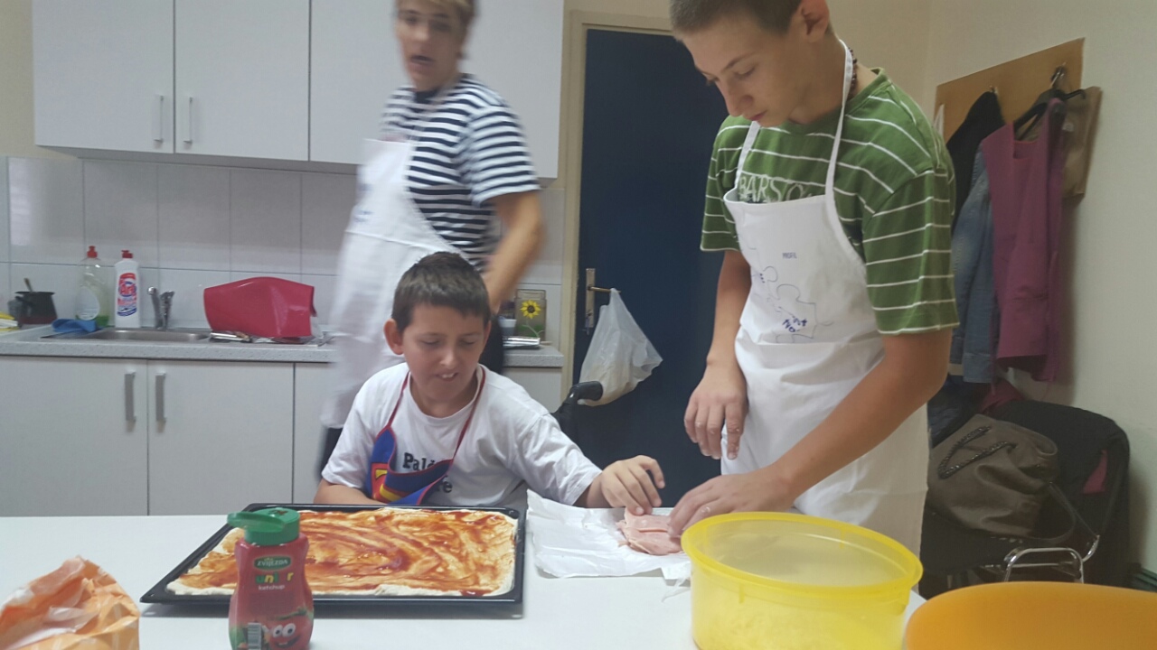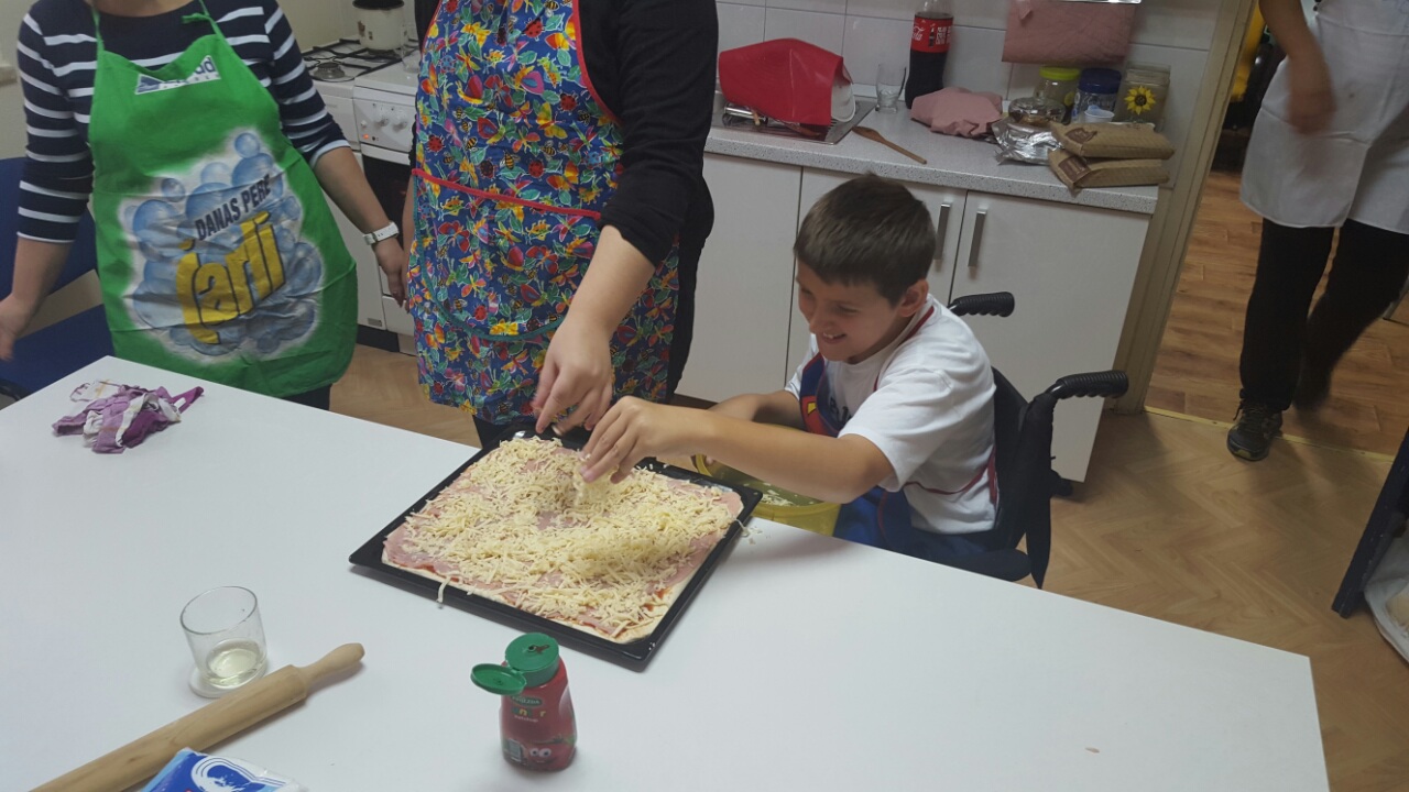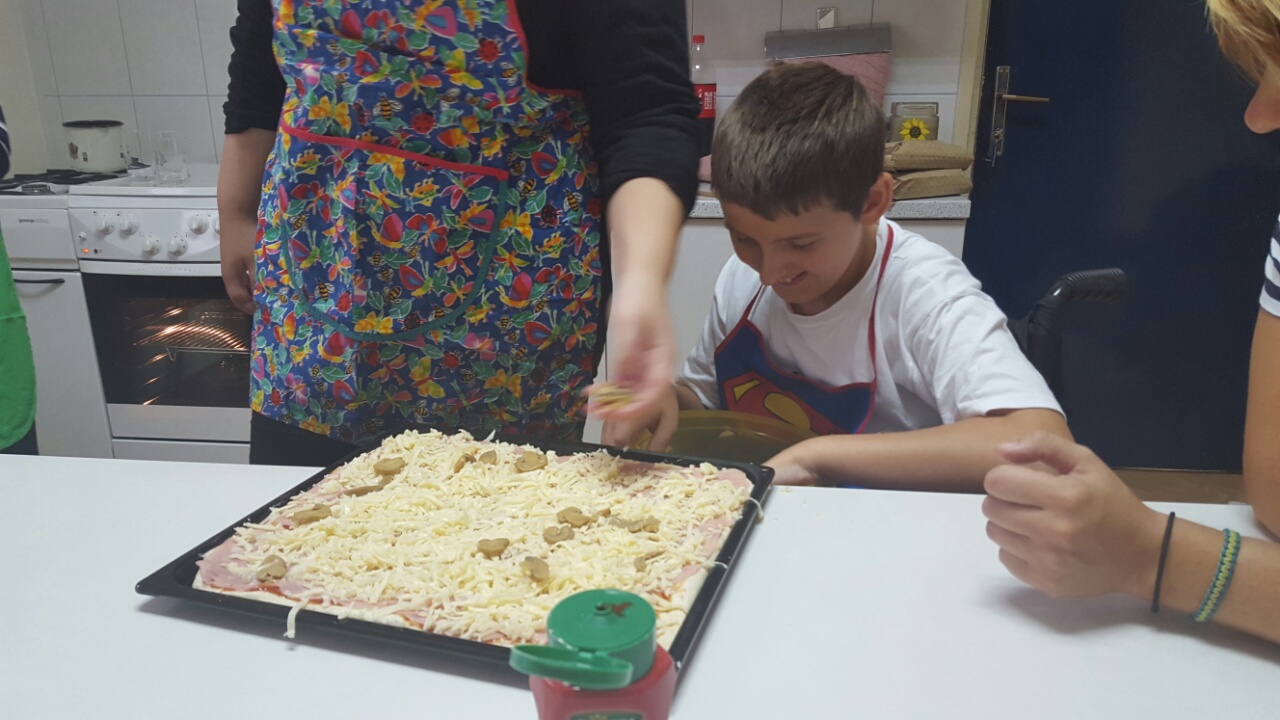 Učenici su sami obavili kupovinu u sklopu koje su odradili i sat matematike… Nije lako zbrojiti sve cijene, skupiti novce i prebrojati ostatak… Školsku čajnu kuhinju preplavili su mali kuhari u šarenim pregačama… Glavni chef Petar razvlačio je tijesto, Mladen je ribao sir, Anđela je mazala ketchup i prala suđe… Za čas se školom proširio miris slasne domaće pizze… Mali kuhari primali su posjete u svojoj kuhinji. Slijedeći zanosni miris u posjete su nam redom dolazili; osmaši, sedmaši, prva susjeda računovotkinja Stela, ravnateljica, tajnica… Treba naglasiti da su mali kuhari za sobom ostavili savršeno urednu kuhinju i oprano suđe! I na kraju zasluženo mali kuhari su marendali svoj specijalitet… Našao se tu i koji komad viška za goste po njihovom izboru… Tako su u slasnim komadima pizze uživali ravnateljica, tajnica i omiljena nastavnica Žana… A kako je to izgledalo iz prve ruke pogledajte sami… Nažalost gotovu pizzu nismo slikali… Nismo stigli... Kad smo se sjetili već je bilo kasno… Toliko je bila dobra…. Do sljedećeg puta pozdravljaju vas školski 3, 2, 1 kuhaj tim!