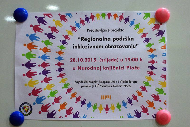 U srijedu, 28. listopada u 19 sati u Narodnoj knjižnici Ploče održana je prezentacija projekta „Regionalna potpora inkluzivnom obrazovanju“. Školski tim (Meri Glavinić, Nataša Palac, Antonela Jončić, Marina Burđelez) predstavio je sve projektne aktivnosti izvan i unutar škole. Prikazan je i edukativni film Riba ribi ne grize rep o učeniku Marijanu Tolju i njegovom razredu. Drago nam je da smo pozitivnim primjerom Marijanovog ravnopravnog uključivanja u sve školske i brojne izvanškolske aktivnosti prikazali cilj kojem težimo.