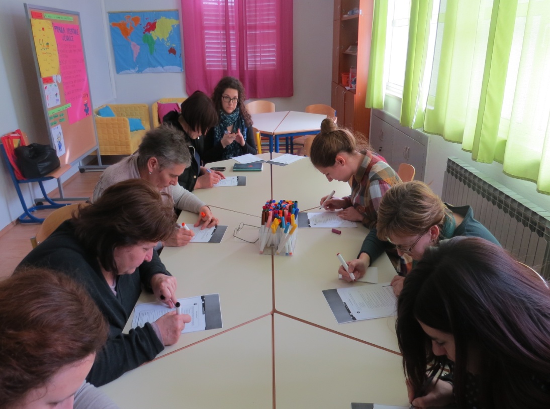 Radionica za učitelje održana je u utorak (16. 2. 2016.) na temu „Pozitivne emocije, mjerenje sreće i optimizma“. Uz ugodno druženje i puno smijeha naučili smo sve o pozitivnim emocijama, te izmjerili optimizam i razinu sreće. Napisali smo i zajedničku pjesmu.