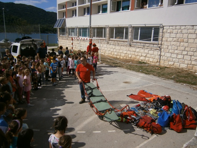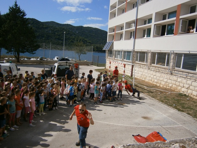 Vježbe spašavanja održali su u školskom dvorištu, a okupljena djeca su aktivno sudjelovala .
