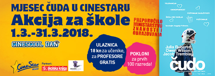 Film „Čudo“ je dobilo pozitivno stručno mišljenje i preporuku Ministarstva znanosti i obrazovanja RH, a kina Cinestar imaju organiziranu akciju ovog mjeseca za škole, u kojoj se za učenike organiziraju izvanredne školske projekcije po cijenama od 18 kn. S obzirom da smo se prijavili među prvih 100 škola u Hrvatskoj dobili smo i prigodan poklon Cinestar-a i njihovog partnera Školske knjige, kojima se ovim putem zahvaljujemo.