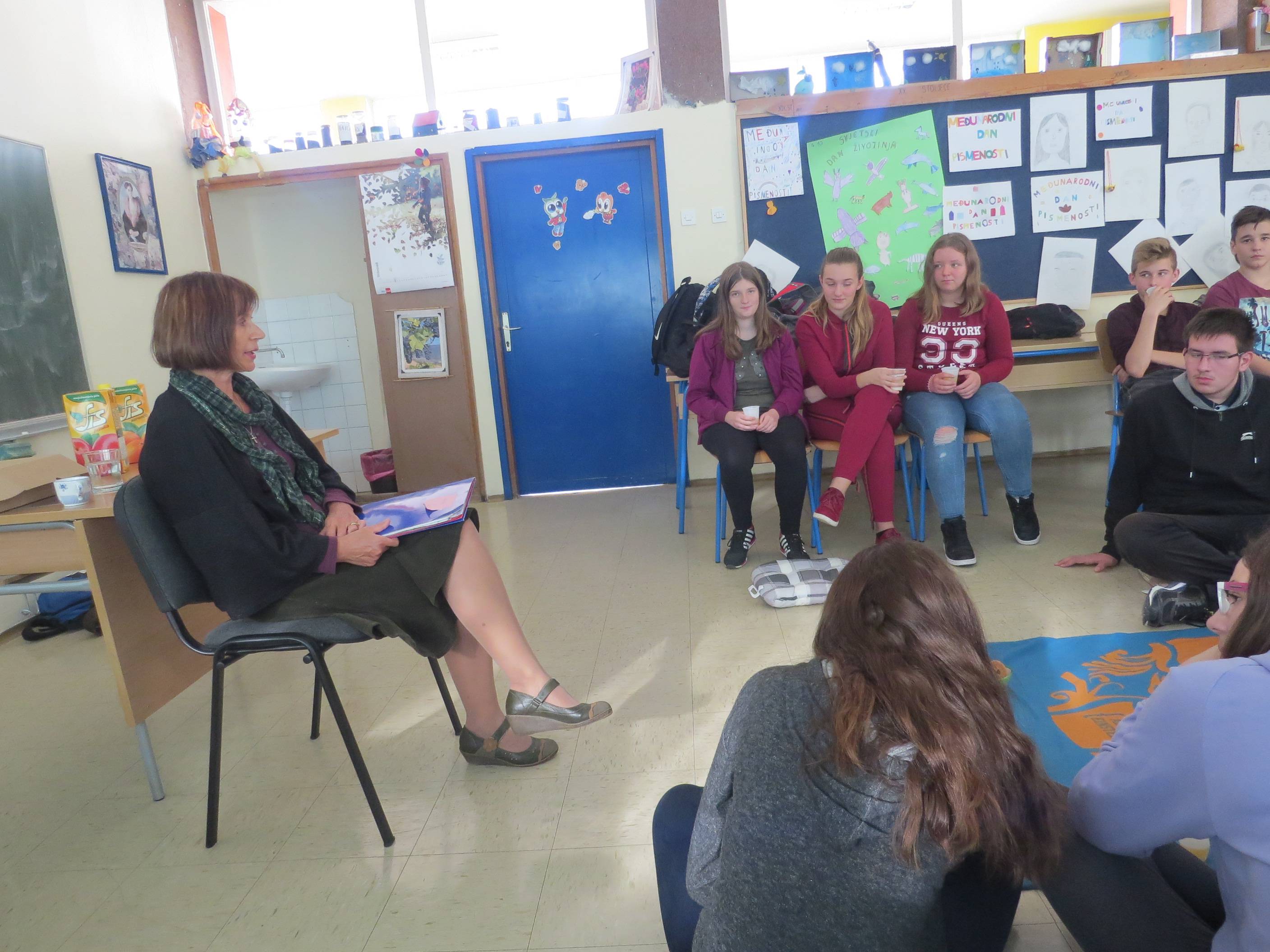 Ovaj mjesec bio je prigodan i za druženje s književnicima. 8.a i 8.b razred sudjelovali su na susretu s pjesnikinjom našega grada i bivšom učiteljicom Hrvatskoga jezika Jelenom Ćelić. Pjesnikinja je učenicima pojasnila ulogu „lijepe riječi“ u njenom životu, govorila je o inspiraciji za pisanje, o početcima stvaranja, ali i o svojim doživljajima tijekom dugogodišnjeg rada s učenicima koji su joj također bili nadahnuće za pisanje. Tako su učenici čuli pjesmu o „šišmišima u klupi“, pjesme zavičajne tematike, ali i pjesme posvećene unucima i dragim ljudima. Nadamo se da je ovaj susret potaknuo učenike na književno stvaranje jer sigurno se u nekome od njih skriva i ovakav umjetnički talent.