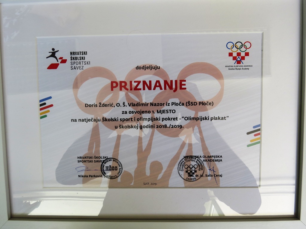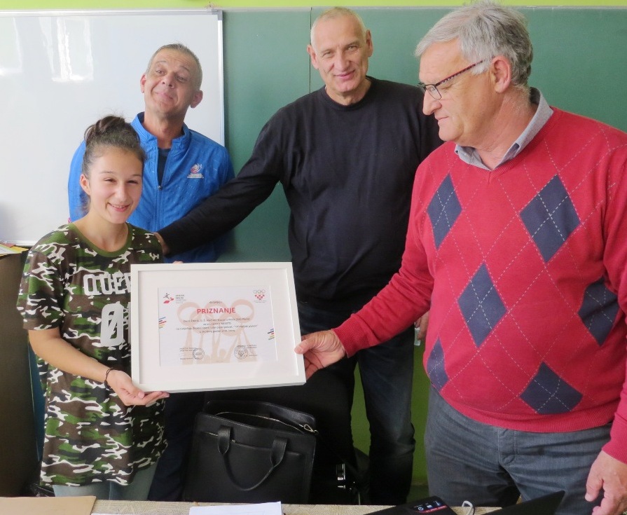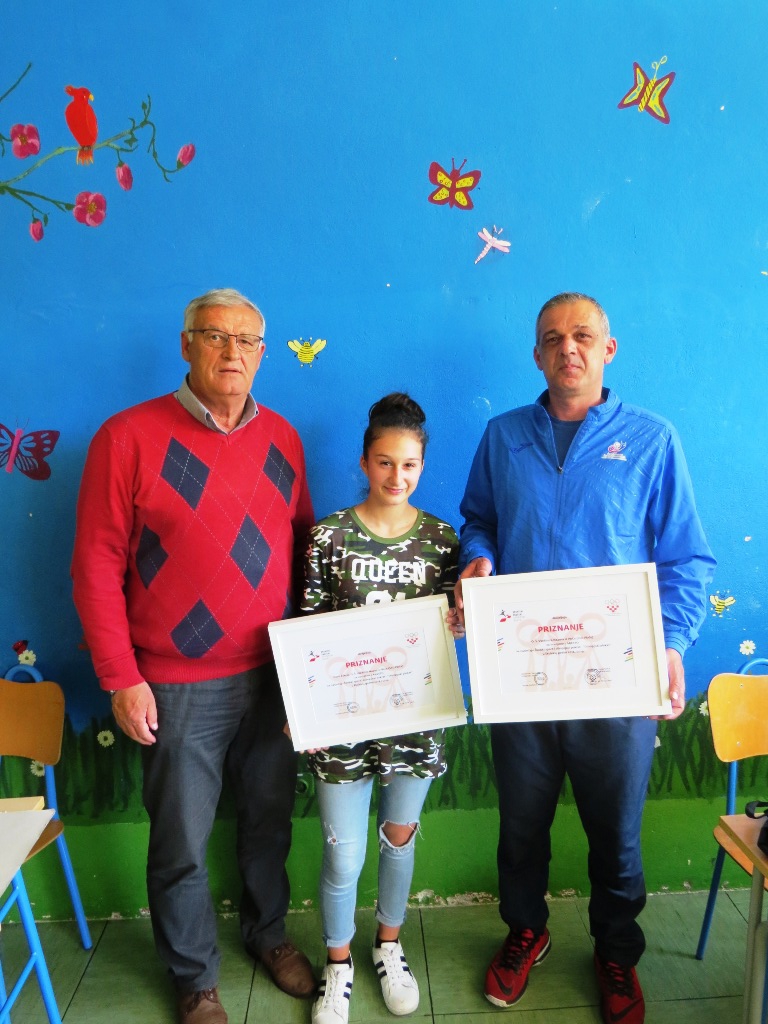 Našoj pobjednici učenici 8. b. razreda Doris Žderić priznanje je uručio predsjednik županijskog školskog sportskog saveza Dubrovačko-neretvanske županije gospodin Boris Krstičević. Priznanje je primila i naša škola (ŠSD Ploče) pod vodstvom učitelja TZK Frane Božića.
