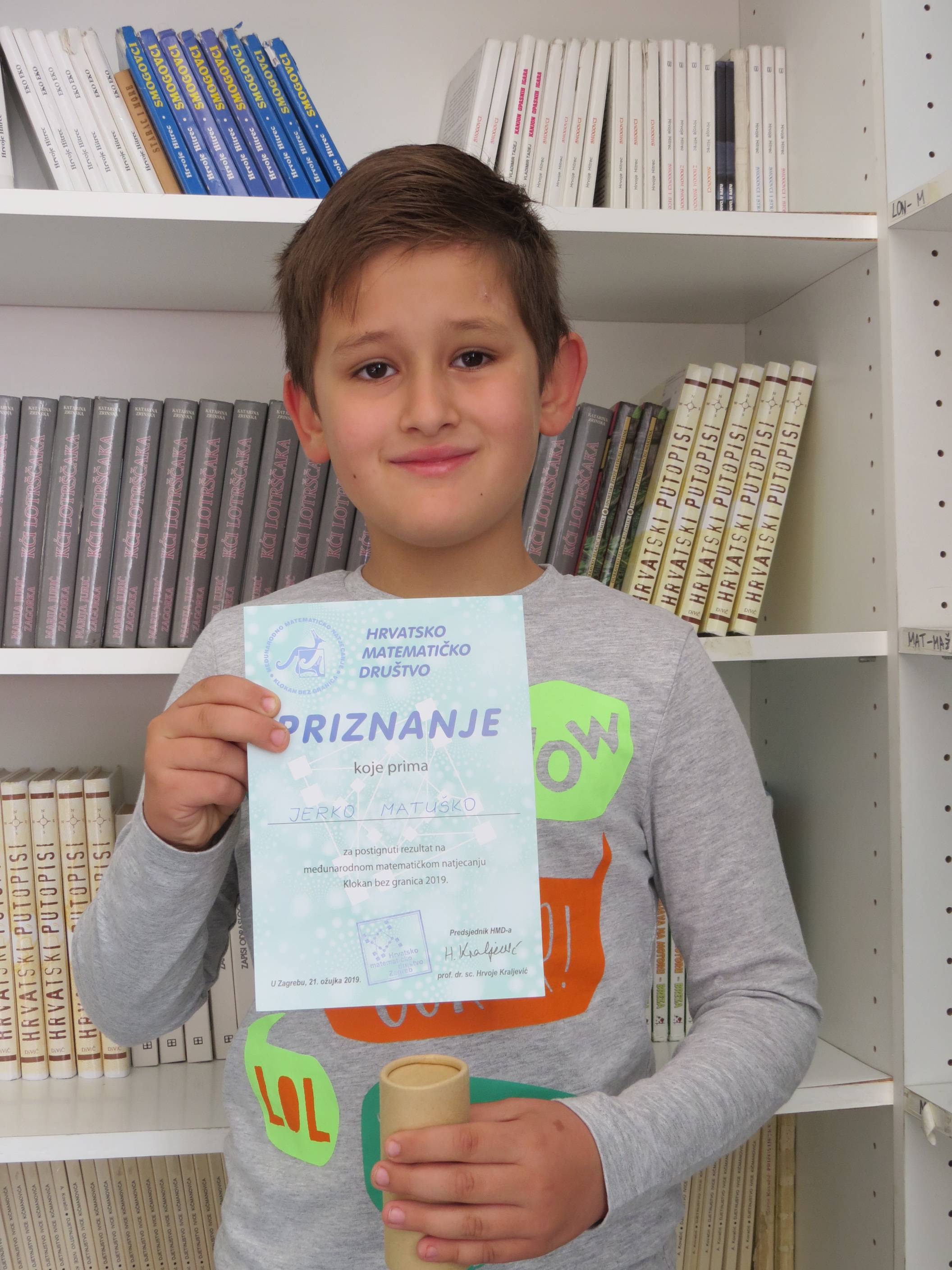 Učenik 2. b razreda naše škole Jerko Matuško (učiteljica Višnja Grančić) dobio je priznanje i nagradu za uspjeh na međunarodnom matematičkom natjecanju "Klokan bez granica 2019." U svojoj kategoriji Jerko je među 10% najboljih učenika!