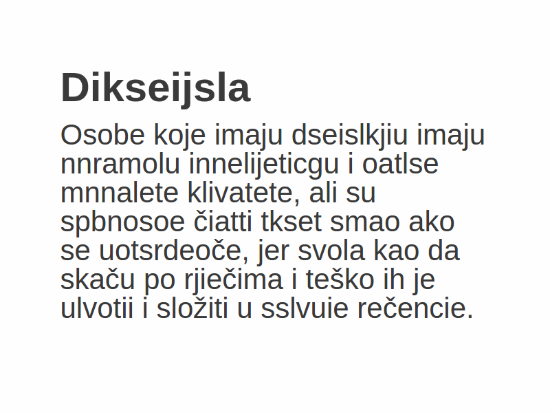 Ova animacija vam pokazuje s kakvim se poteškoćama susreću osobe koje imaju disleksiju. Zamislite koliko bi njima značilo da mogu normalno čitati i uživati u pisanoj riječi...