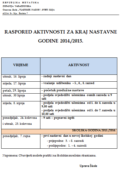 RASPORED AKTIVNOSTI ZA KRAJ NASTAVNE GODINE 2014./2015.